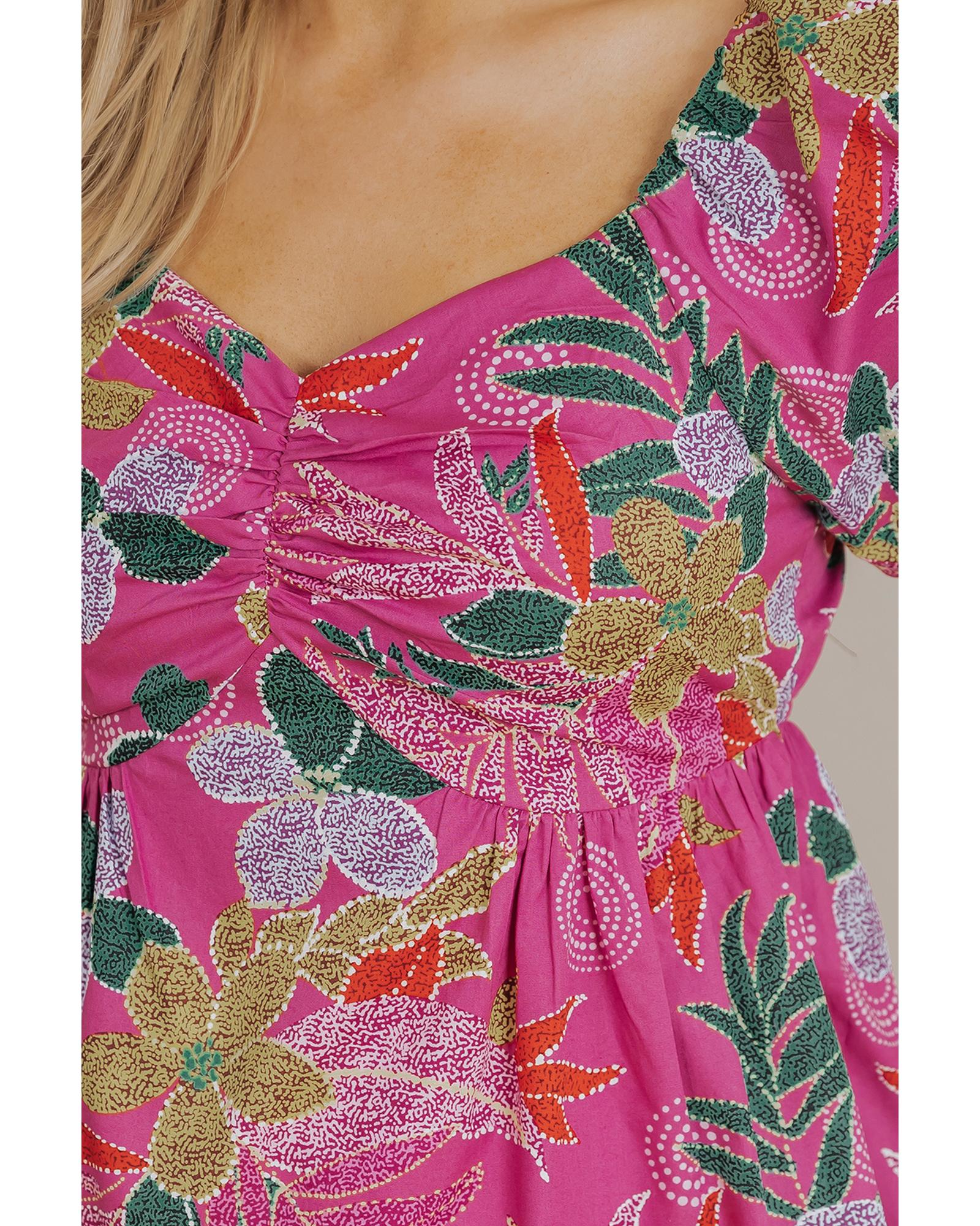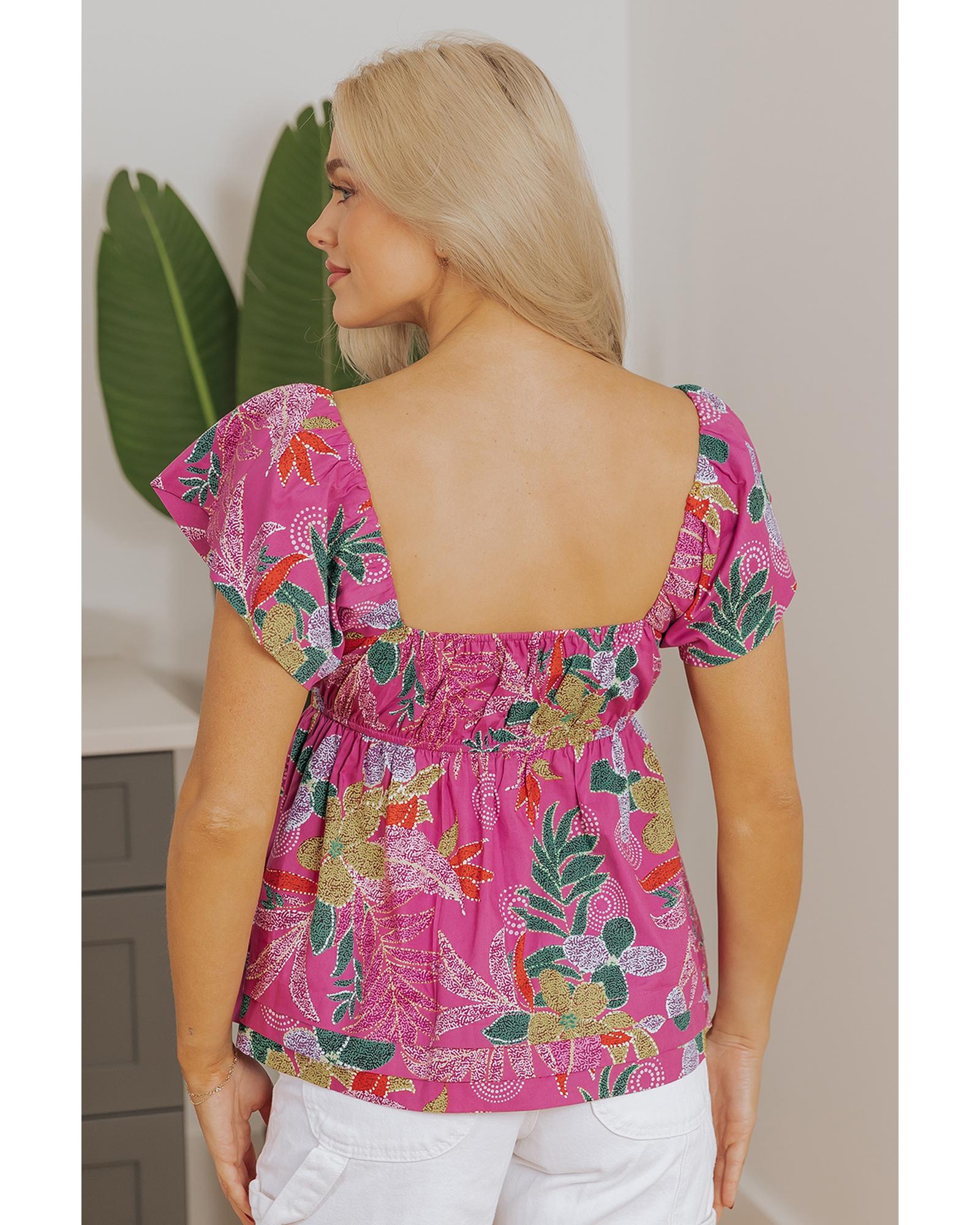 Purple Floral Print Sweetheart Neck Flutter Sleeve Blouse – L