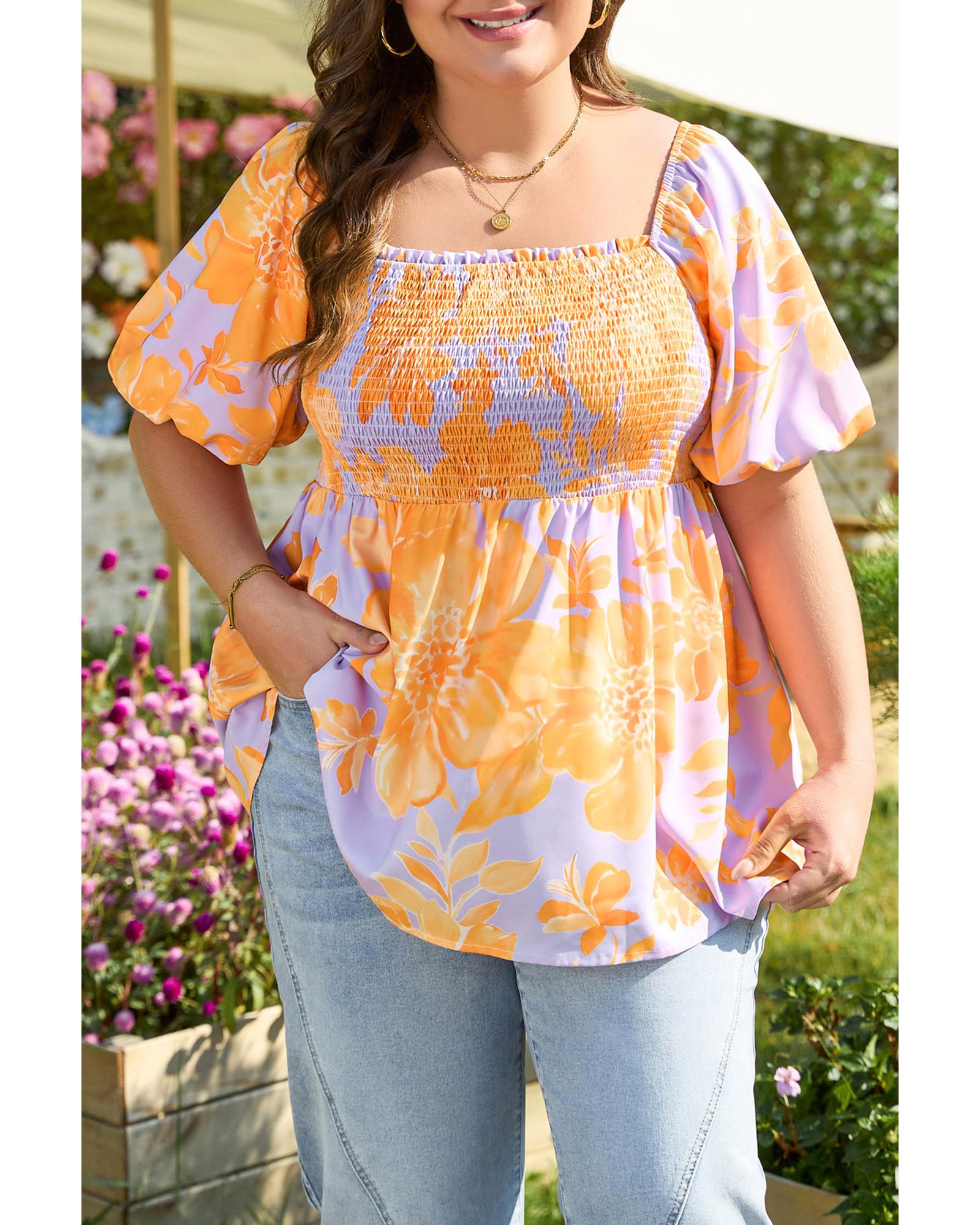 - Purple Floral Puff Sleeve Square Neck Smocked Plus Size Babydoll Blouse