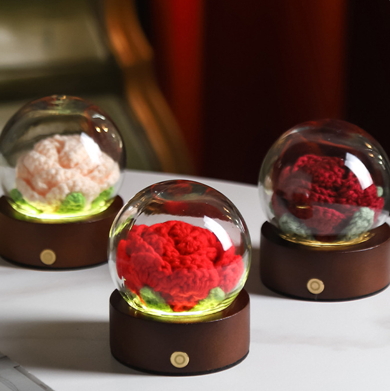 - 1 x Crochet Flower LED Night Light with Glass Dome & Wood Base