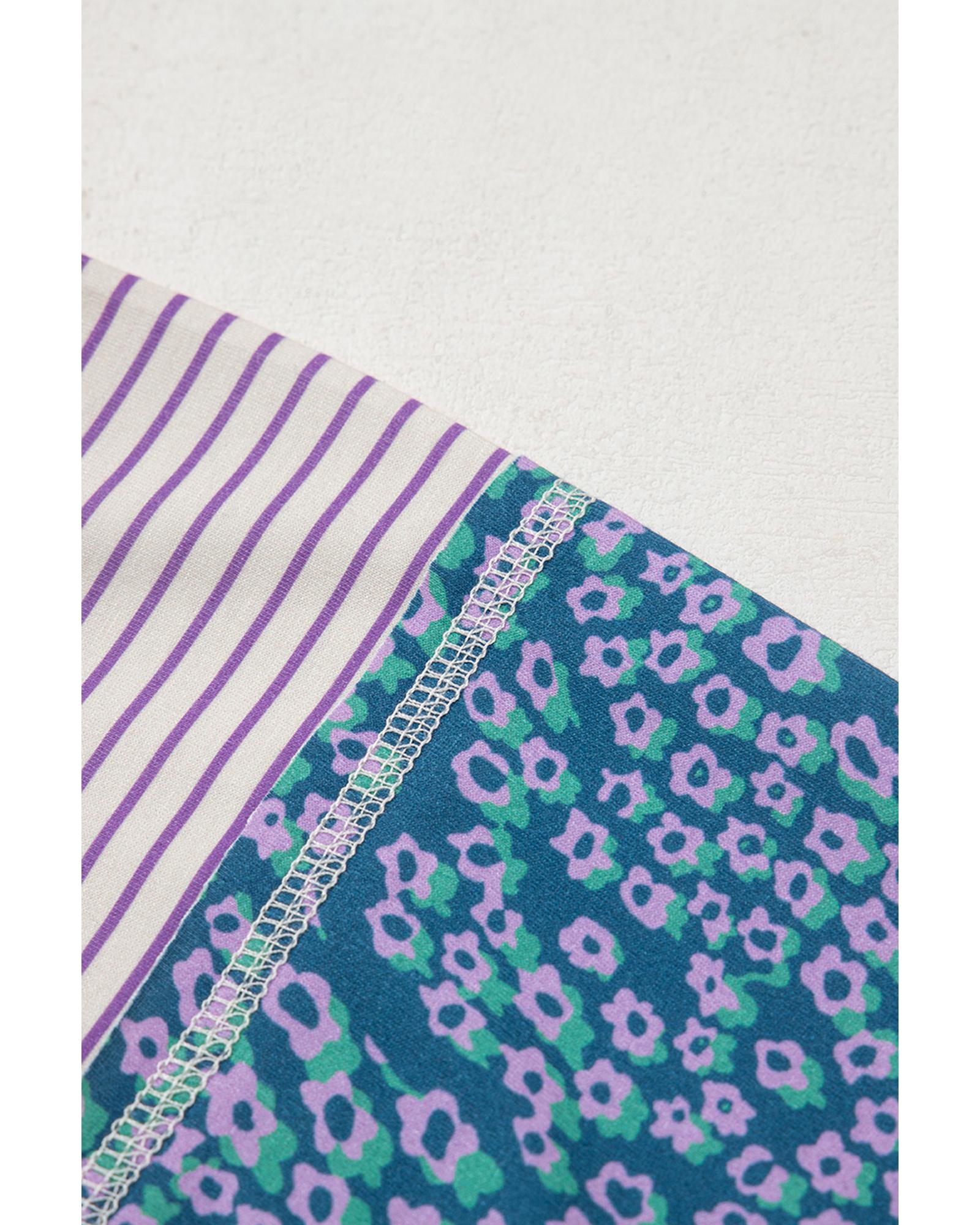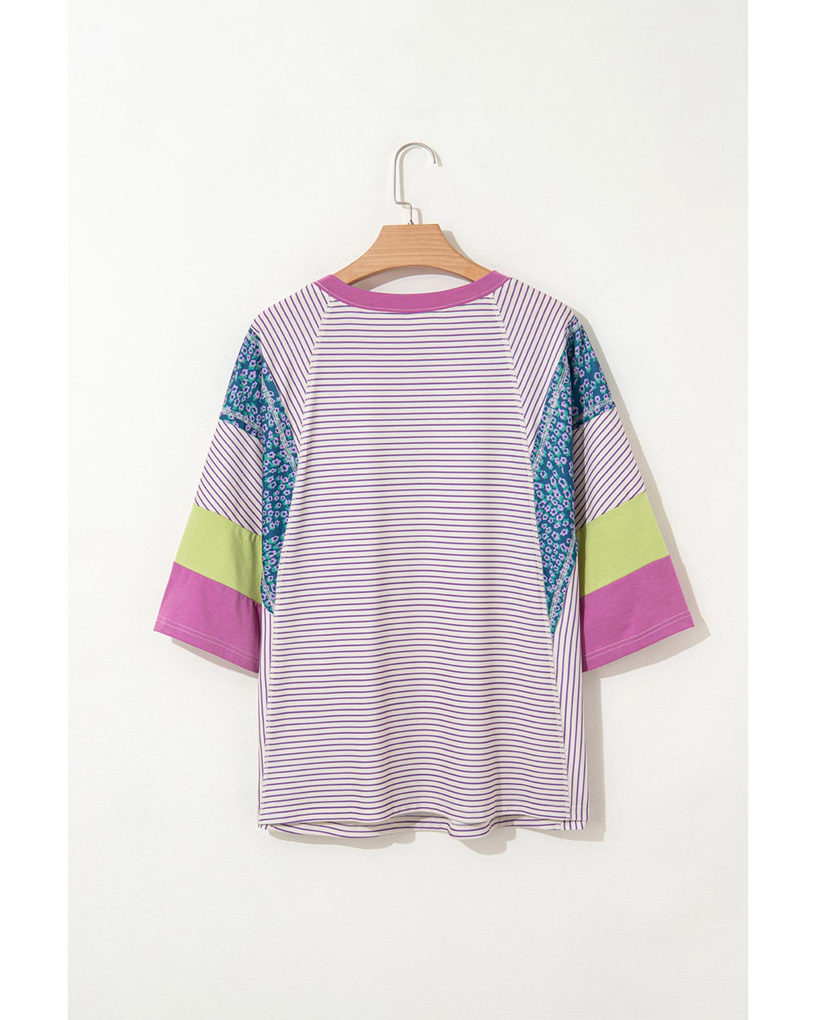 Purple Stripe Floral Color Block Raw Edge Patchwork Bracelet Sleeve Blouse – M