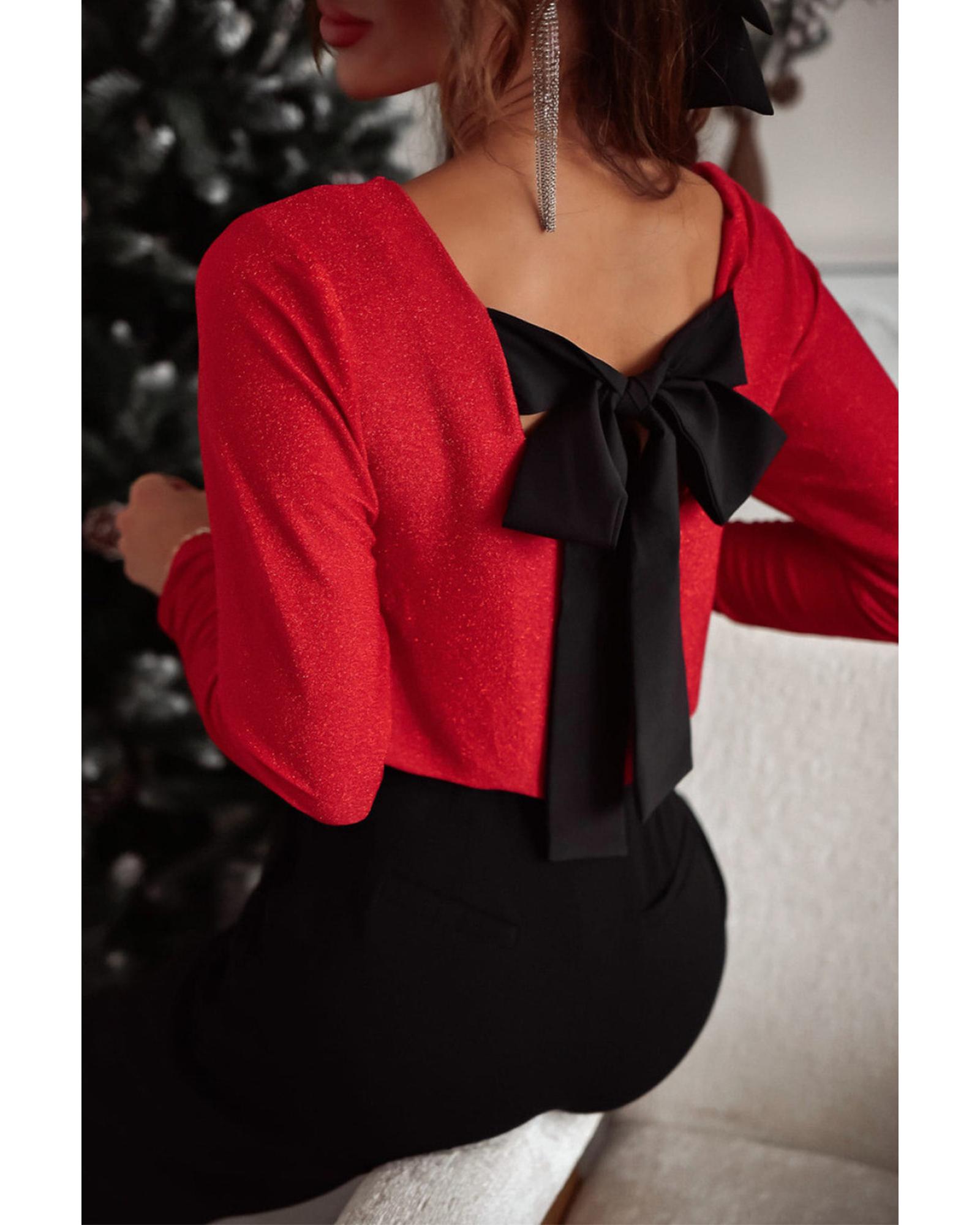 Racing Red Metallic Bowknot Open Back V Neck Top – L