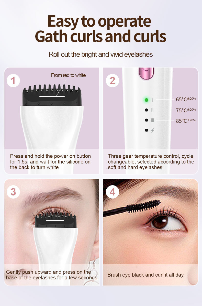 Achieve perfectly curled, long-lasting eyelashes safely and effortlessly with our Rechargeable Heated Eyelash Curler. Say goodbye to the worries of traditional curlers like broken lashes or sore eyelids, and avoid the risks of heated cotton swabs or damaging false eyelash applications. This innovative curler features an anti-scalding comb teeth design and rapid 30-second heating. With three adjustable temperature settings (65C, 75C, 85C), it caters to different eyelash types �C from short and soft to regular, and longer, harder lashes. The ergonomic, concave arc design fits the eye shape perfectly, curling all lashes from root to tip. Conveniently USB rechargeable, it supports various charging methods and offers up to 15 days of endurance on a single charge (used once daily). The device includes LED indicators for gear position and power status, a protective cover, and a cleaning brush for easy maintenance.