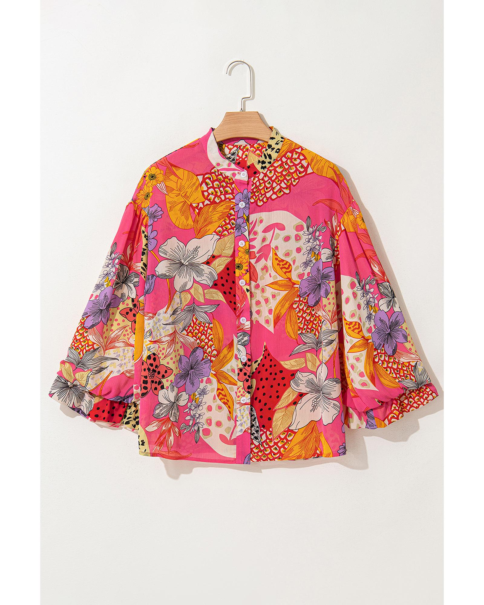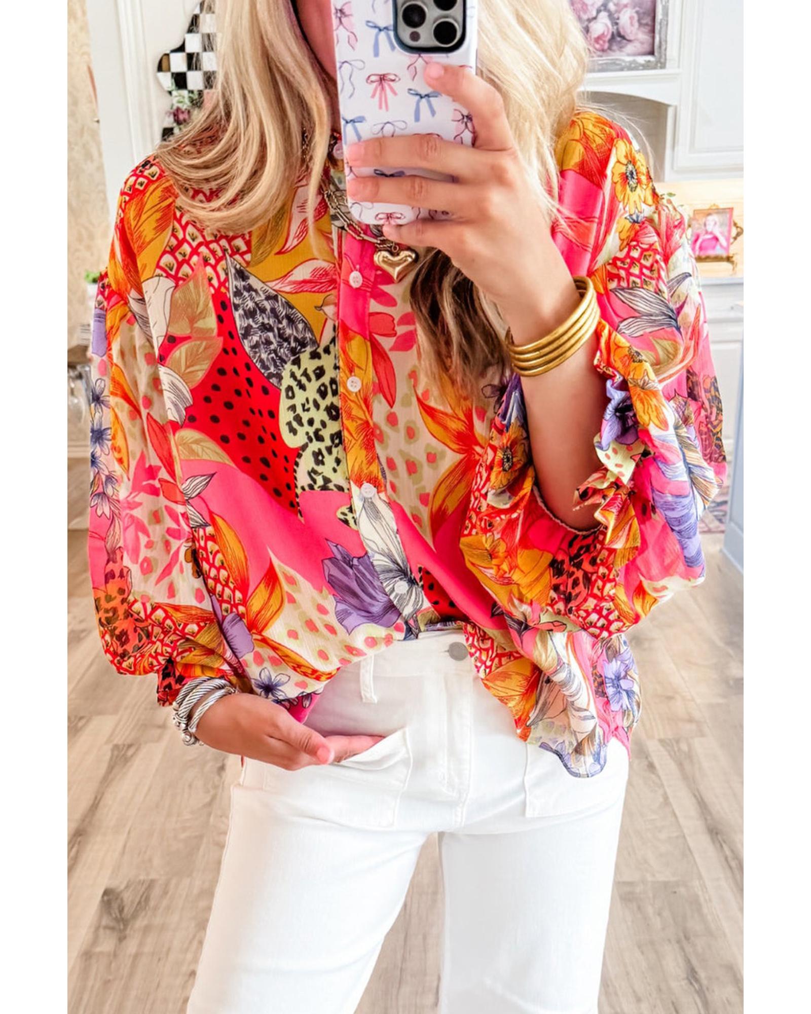 Red Abstract Floral Print Buttoned Ruffled Bubble Sleeve Shirt – M