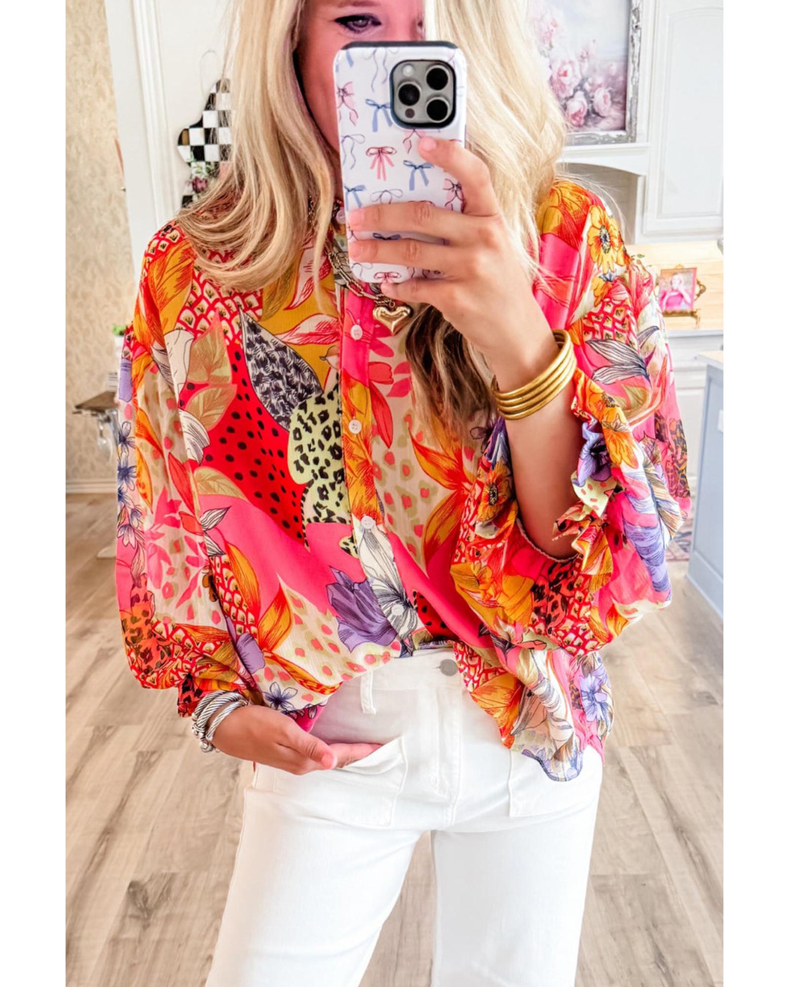 Red Abstract Floral Print Buttoned Ruffled Bubble Sleeve Shirt – S
