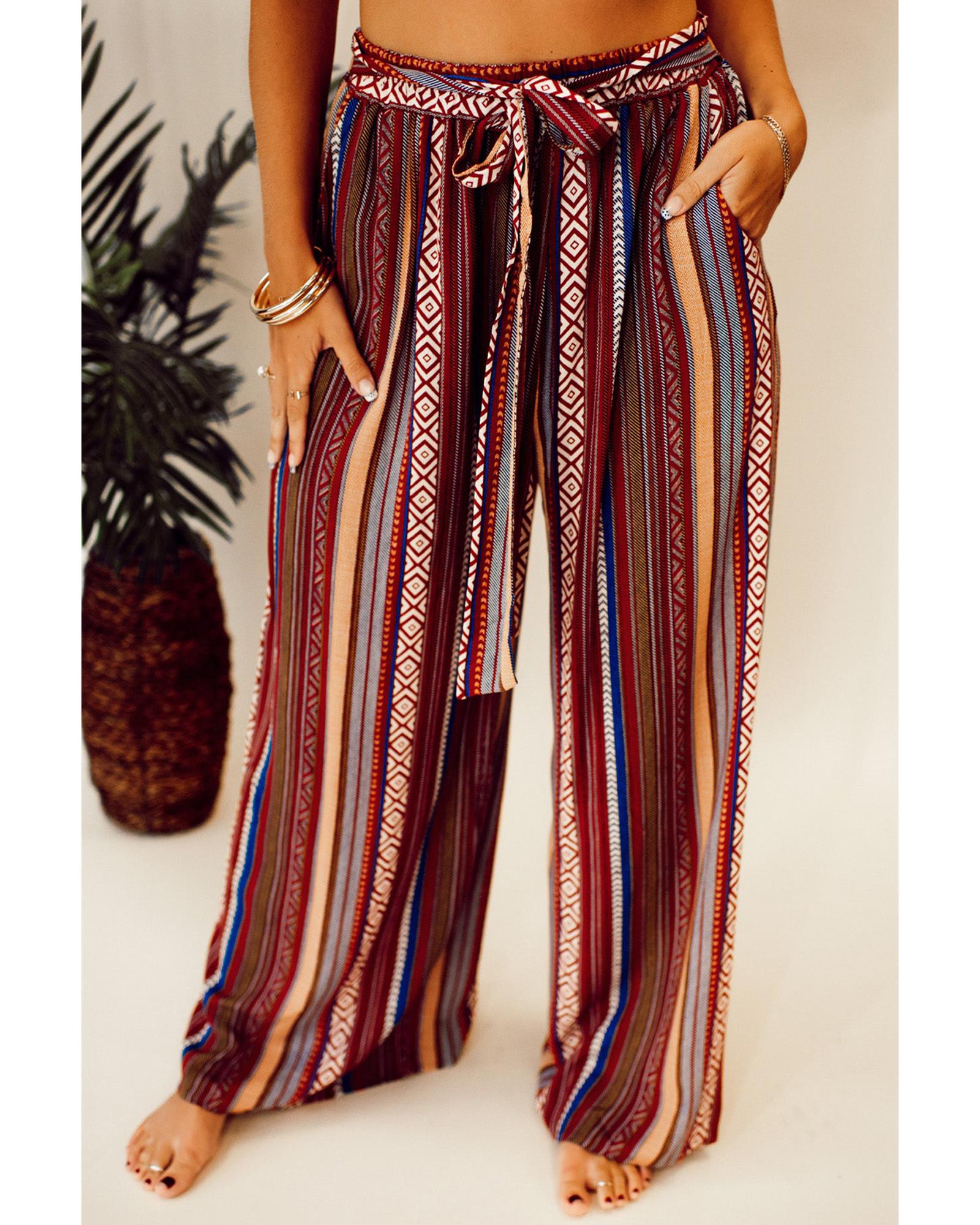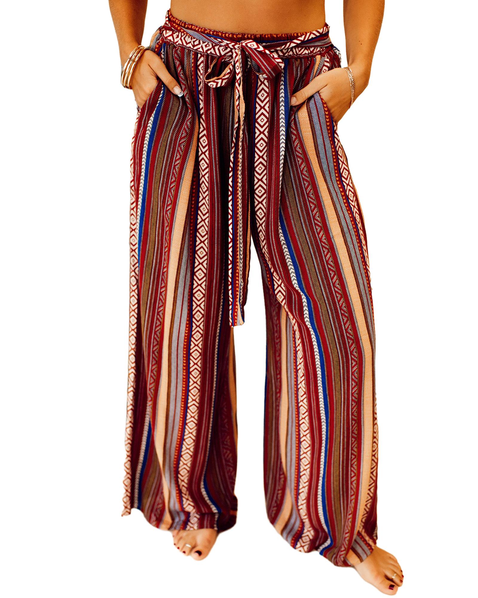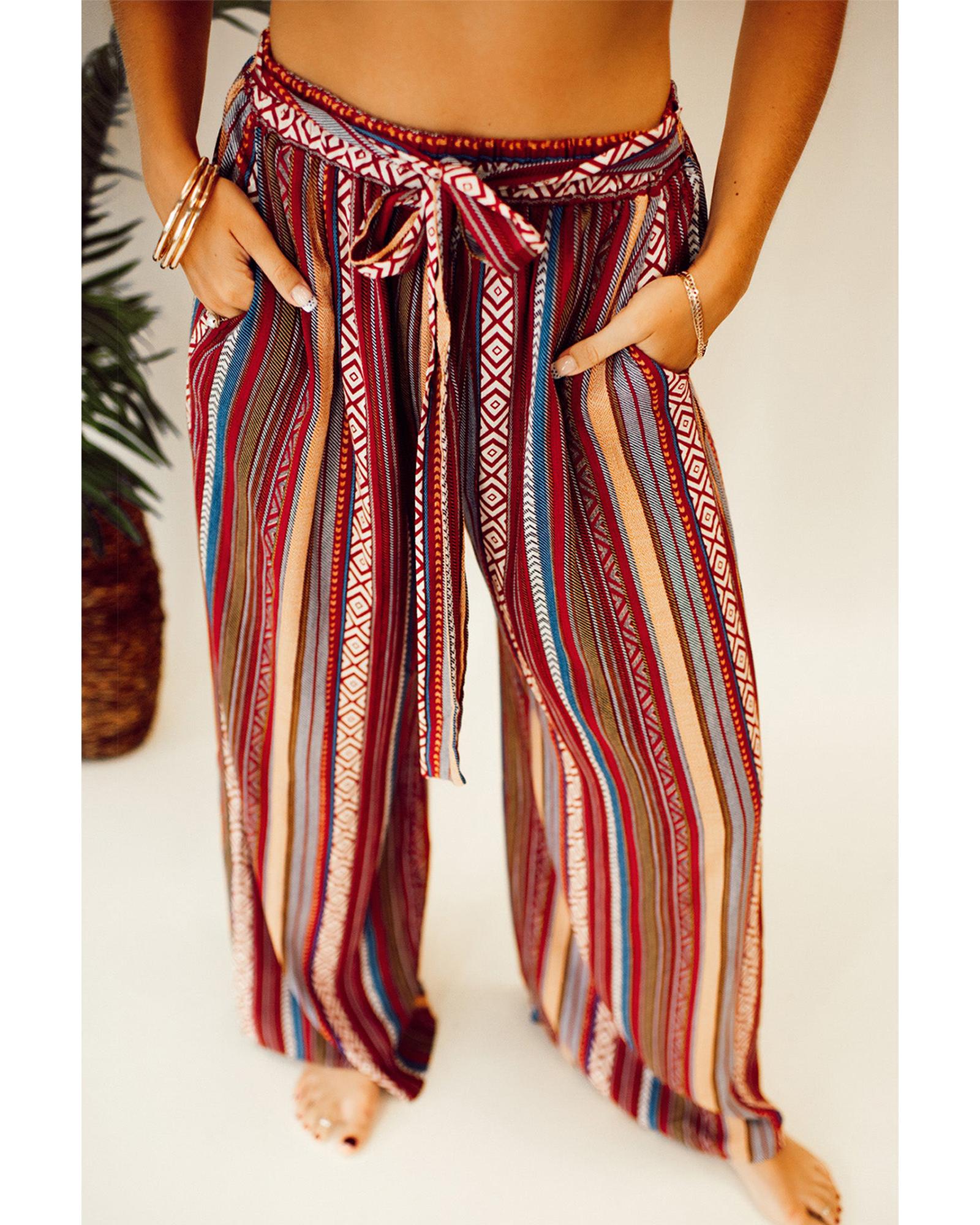 Red Boho Ethnic Striped Print Tie Waist Wide Leg Pants – M
