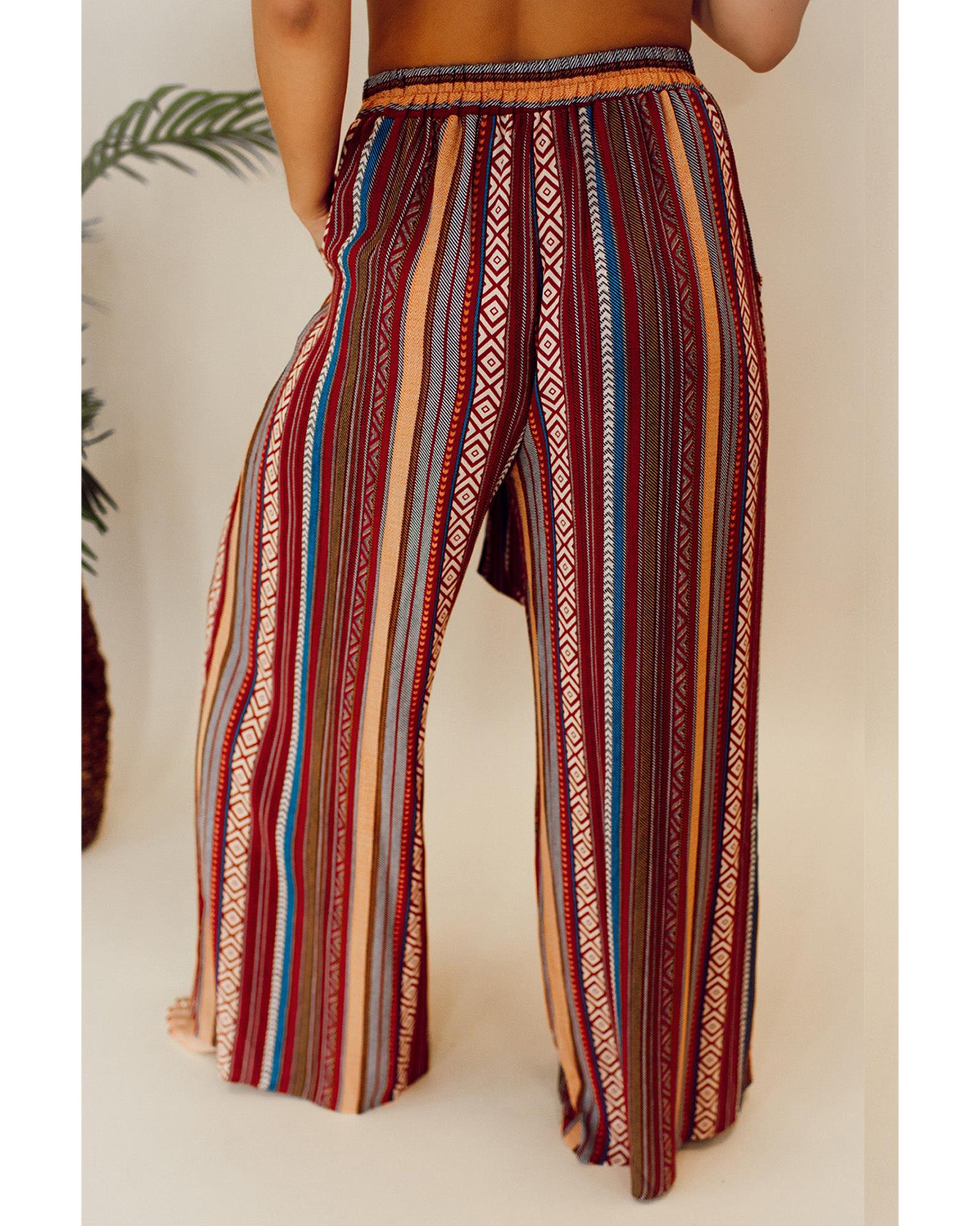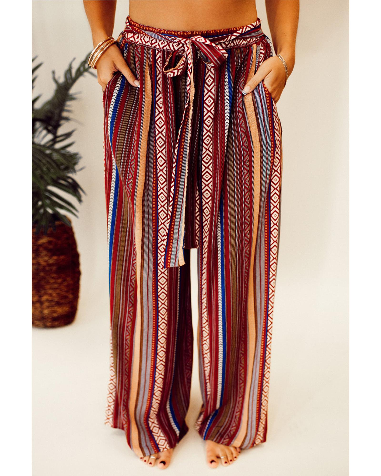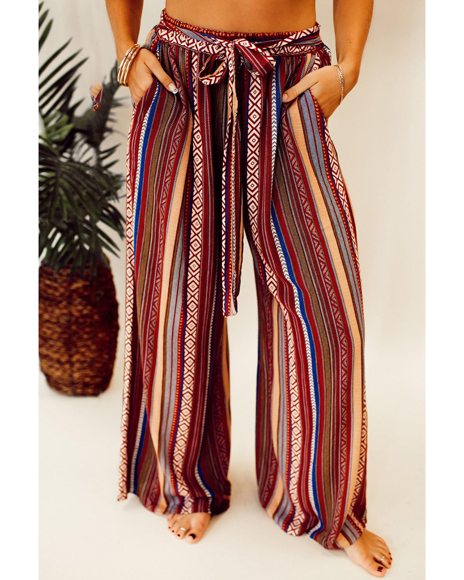 Red Boho Ethnic Striped Print Tie Waist Wide Leg Pants – M