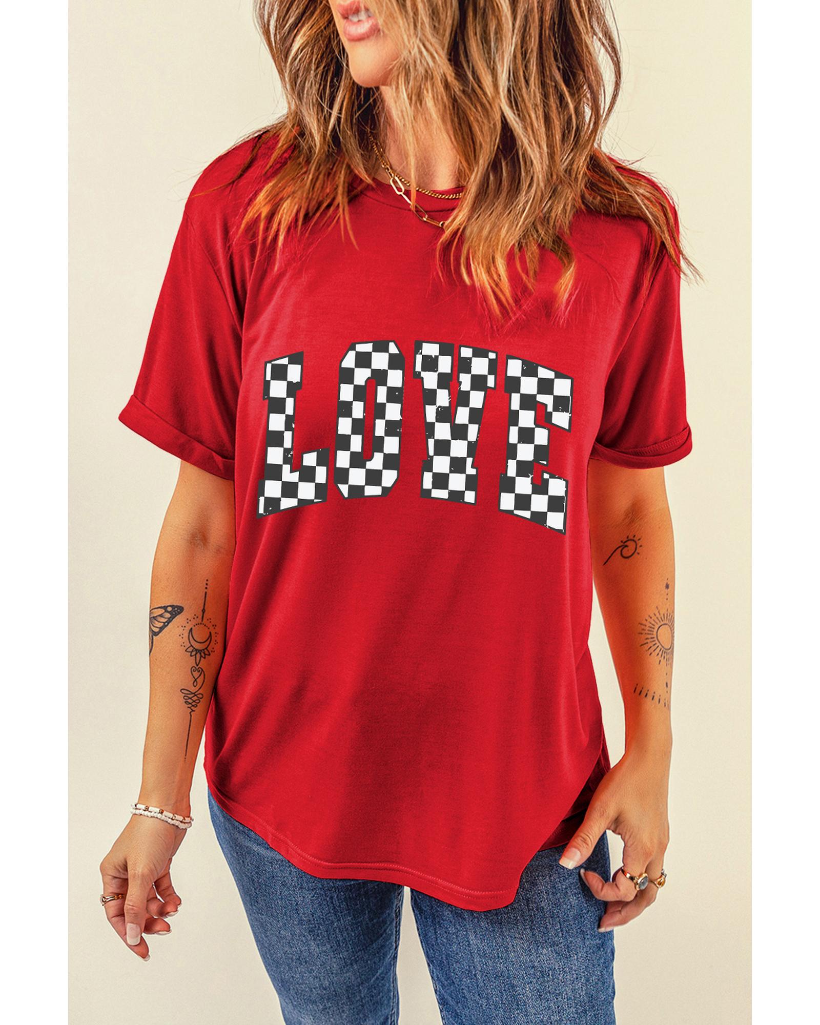 Red Checkered LOVE Letter Graphic Valentines T Shirt – M