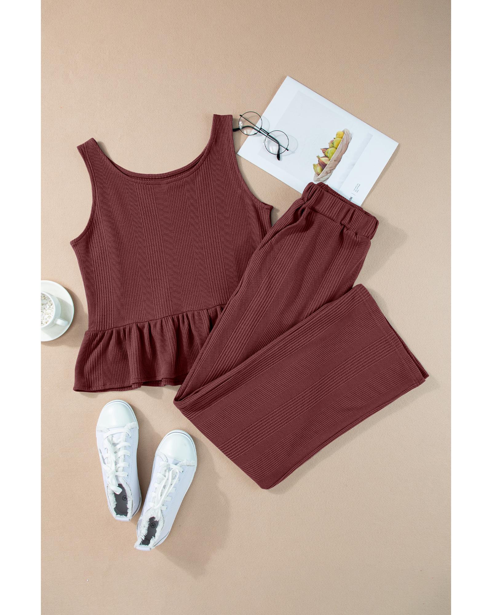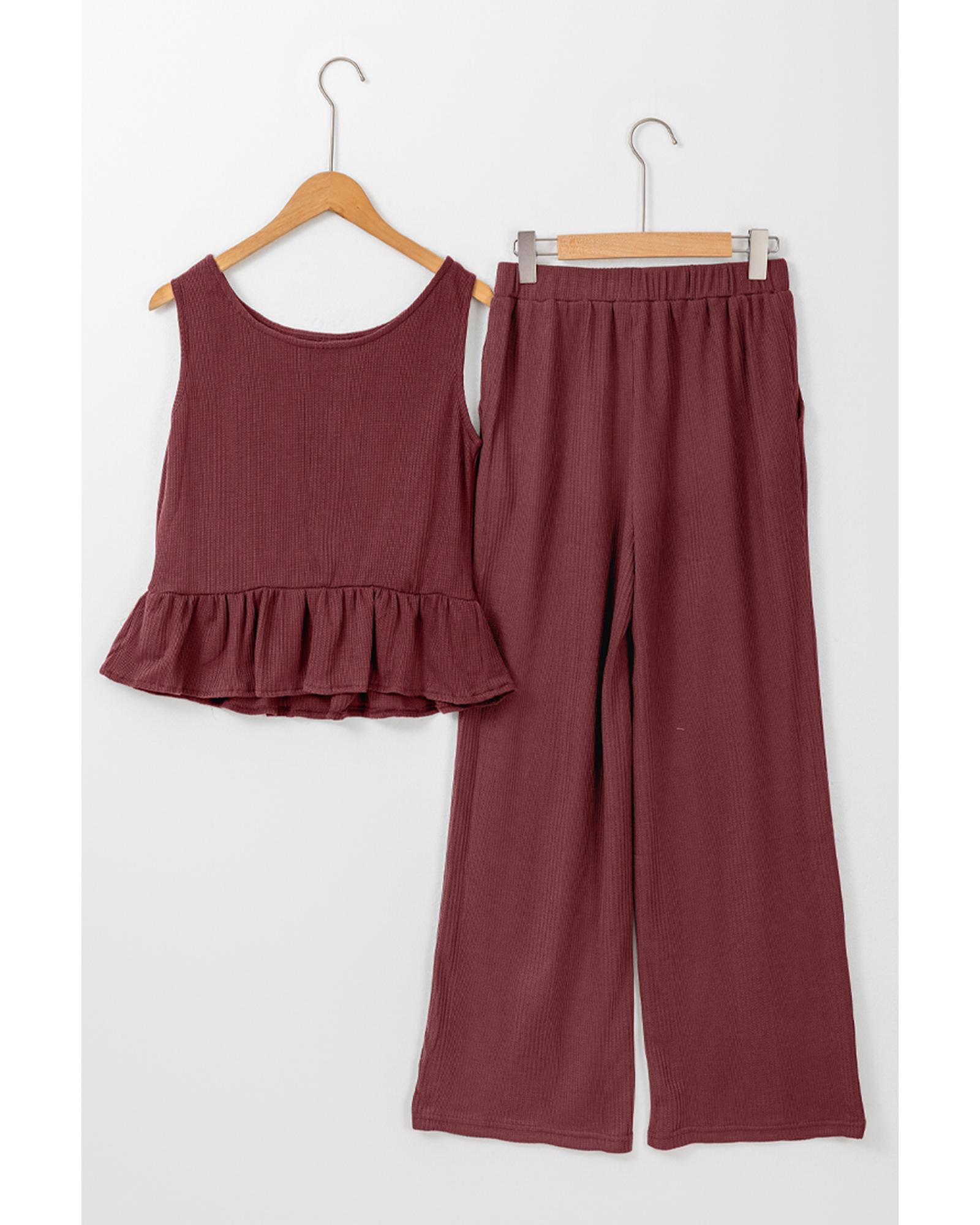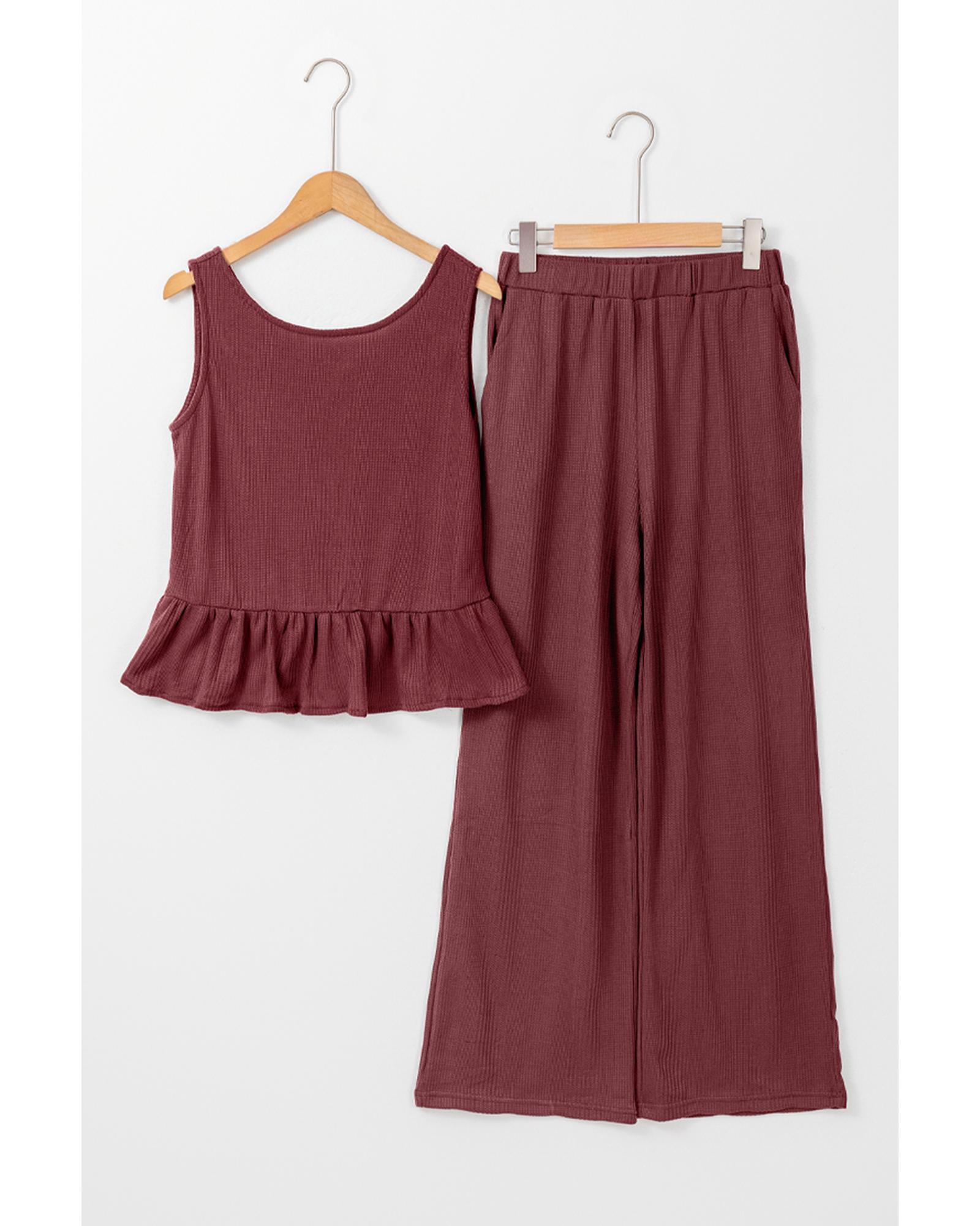 Red Dahlia Solid Color Ribbed Ruffle Tank Top and Pants Set – L