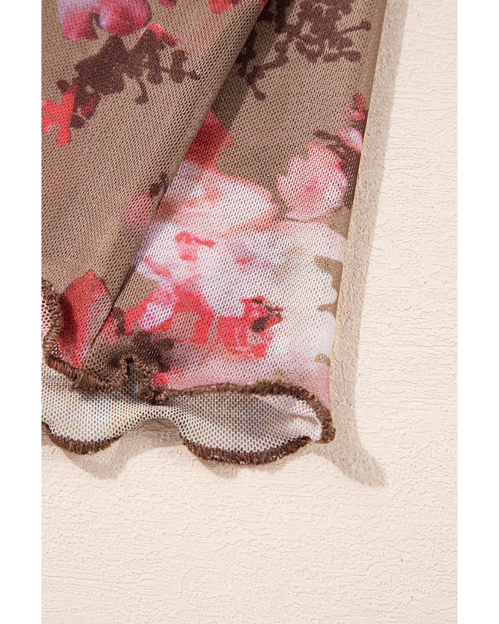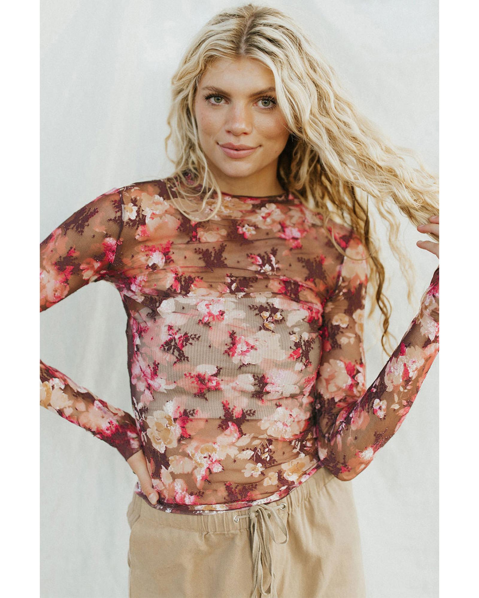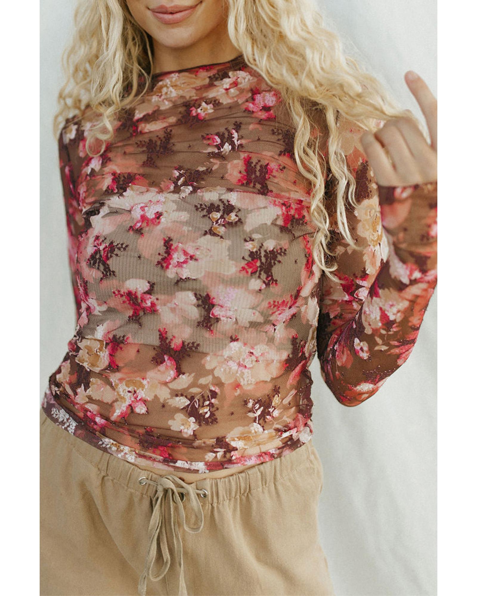 - Red floral print sheer mesh long sleeve top