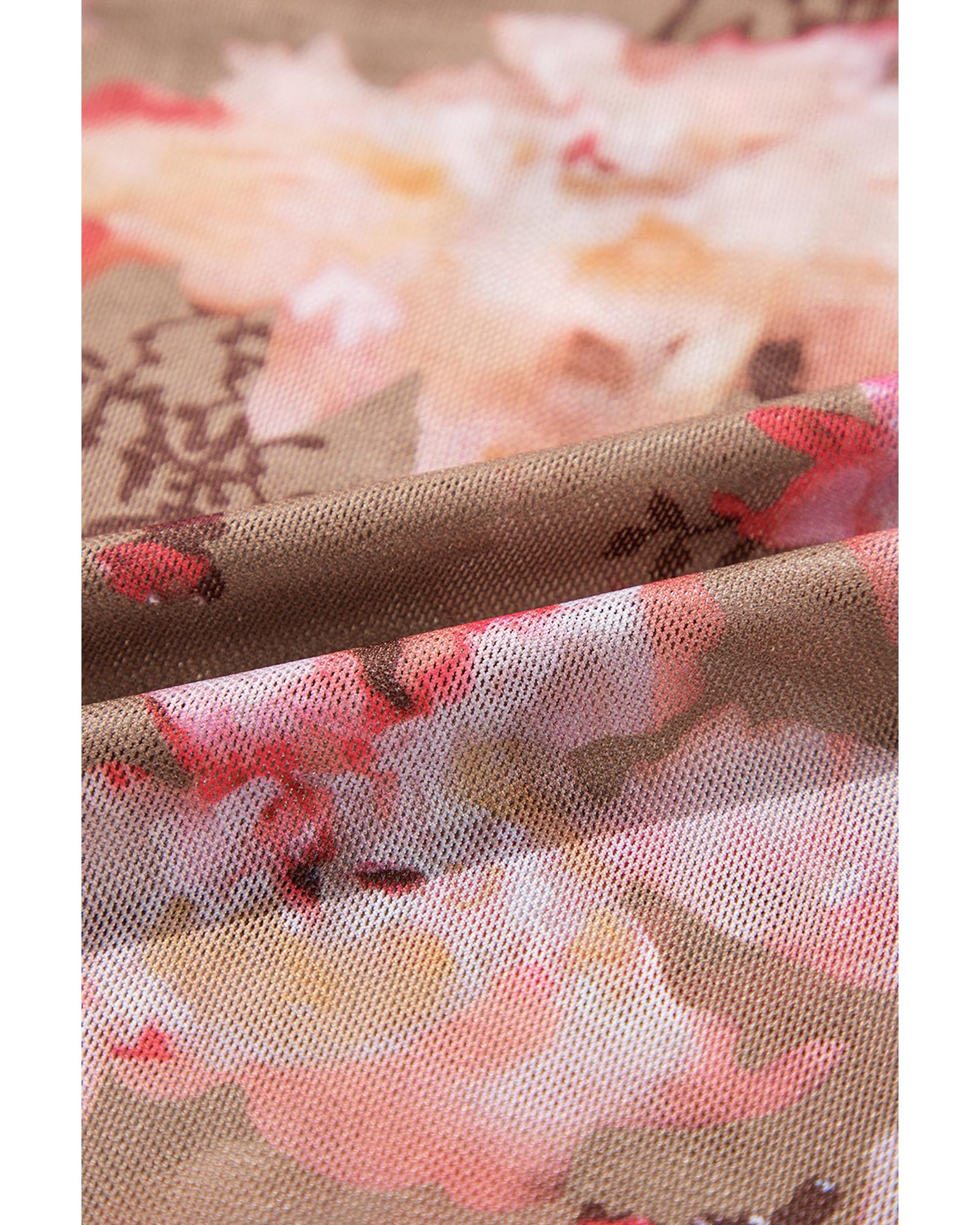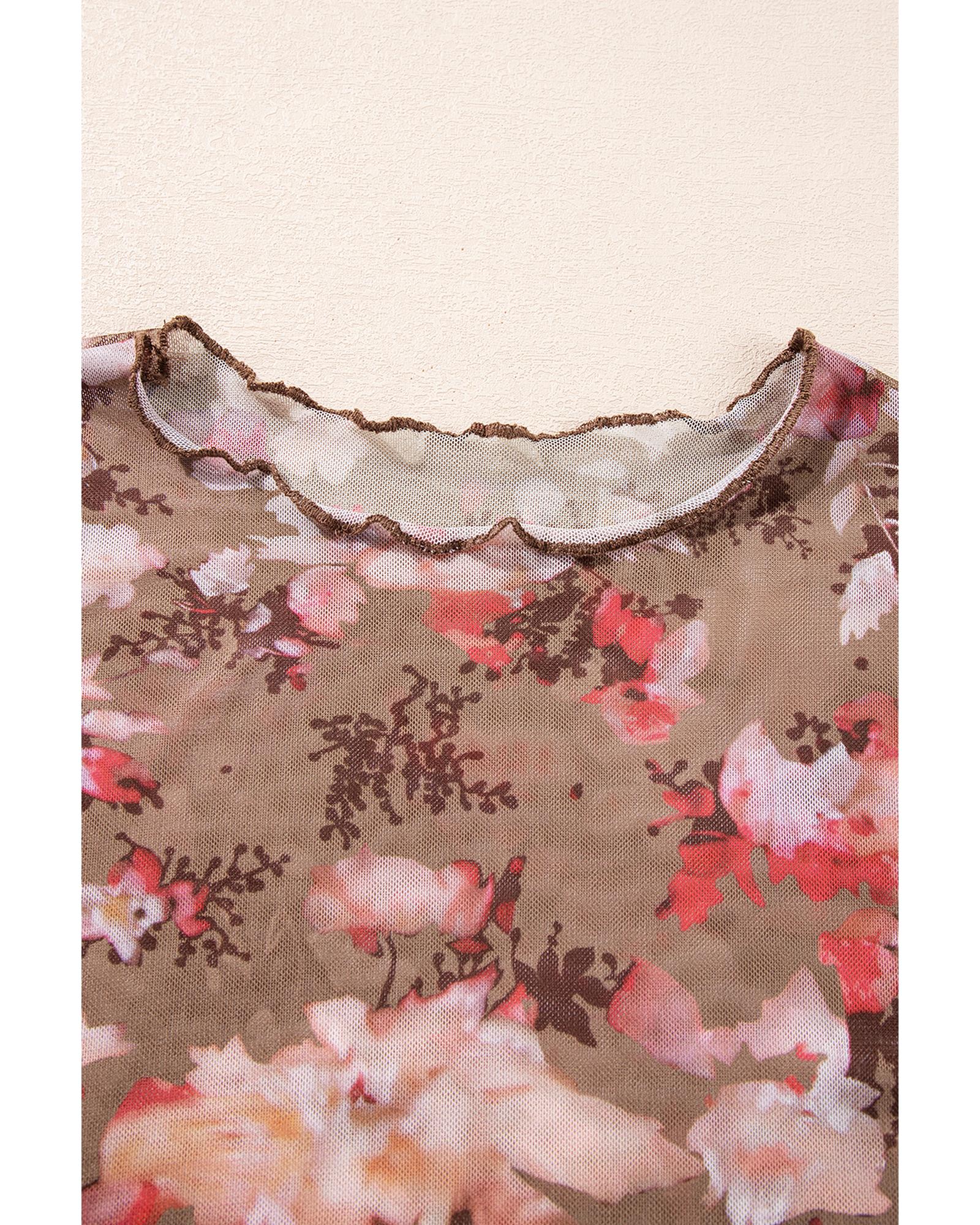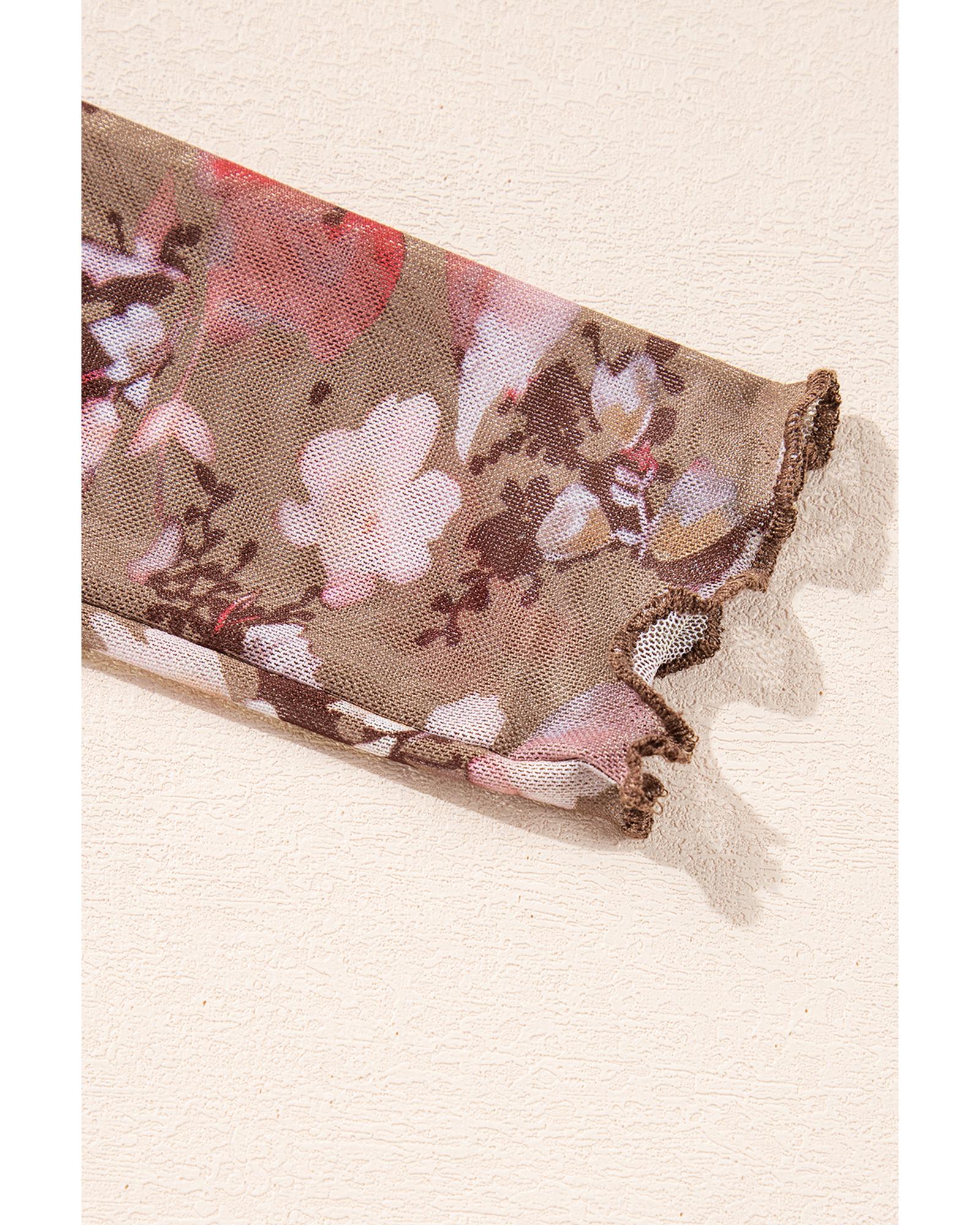 - Red floral print sheer mesh long sleeve top