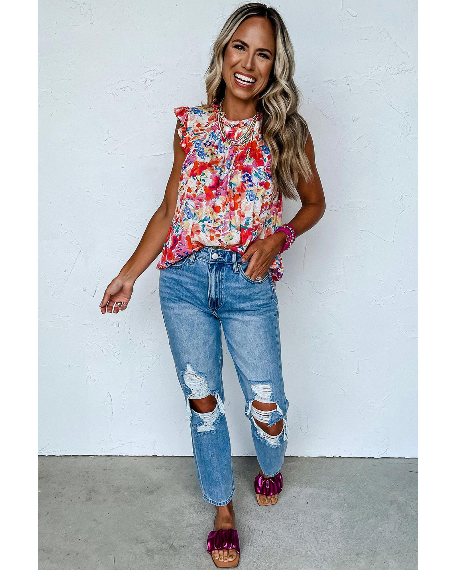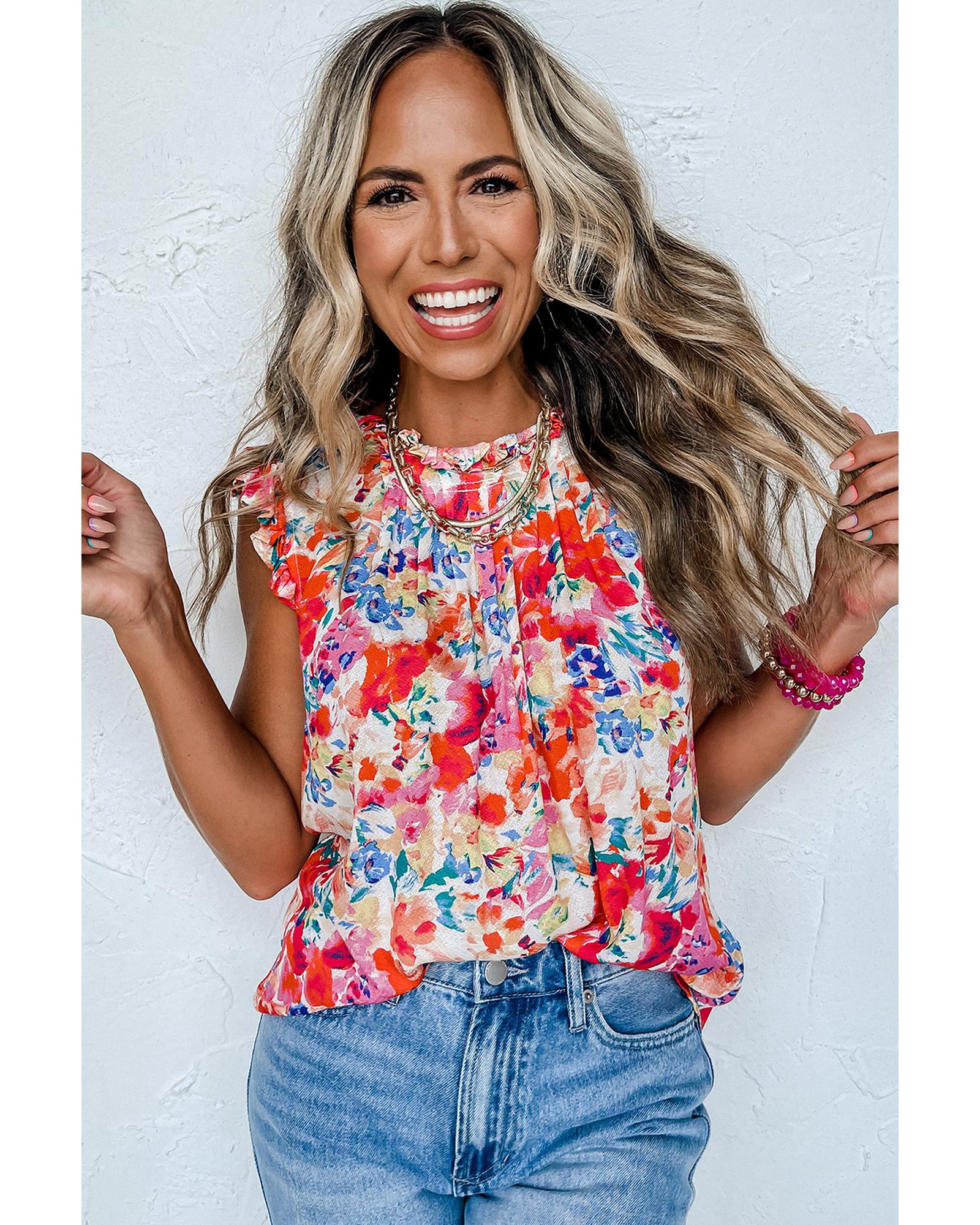 - Red Frilled Neck Pleated Boho Floral Tank Top
