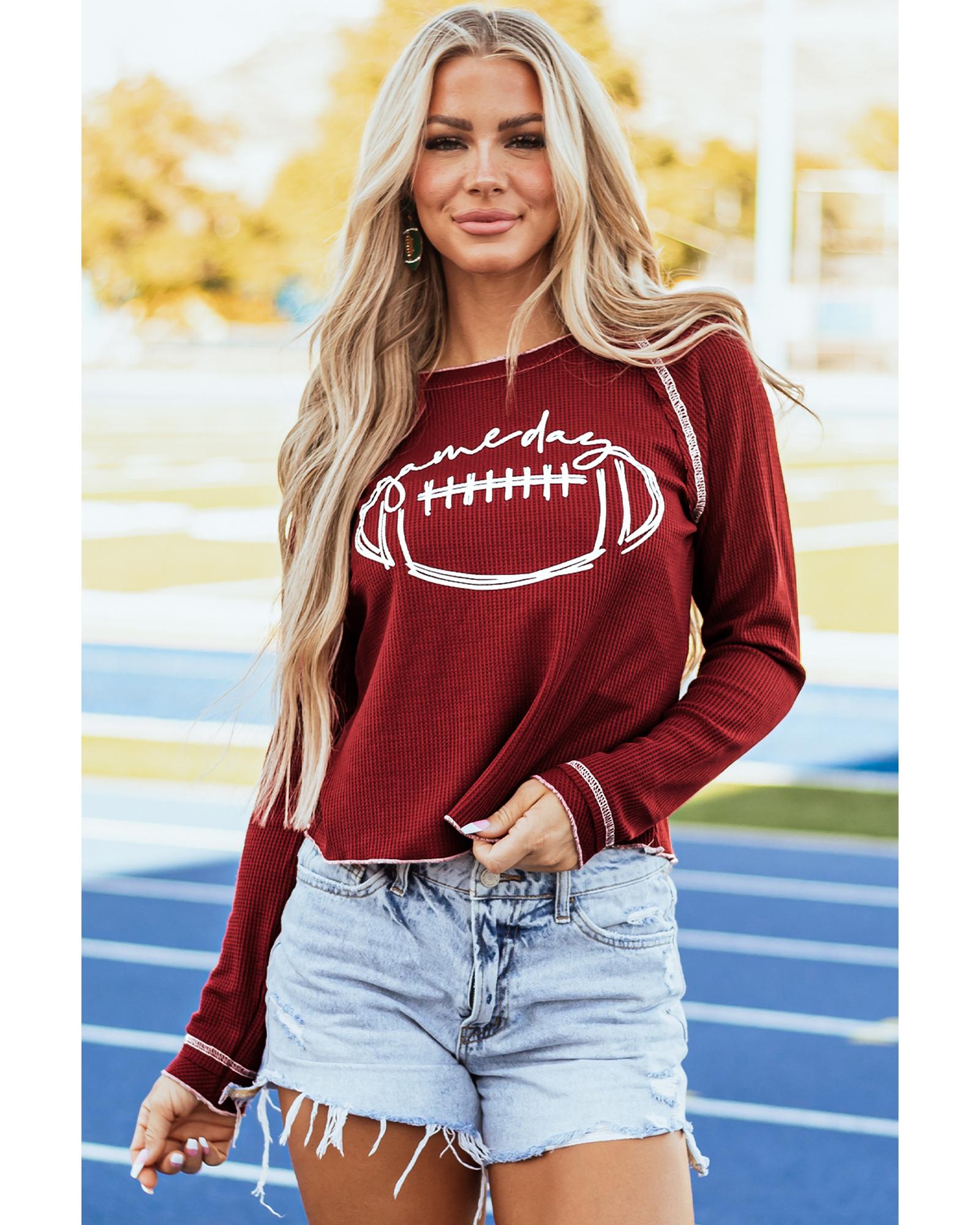 Red Game Day Rugby Football Graphic Thermal Knit Top – S