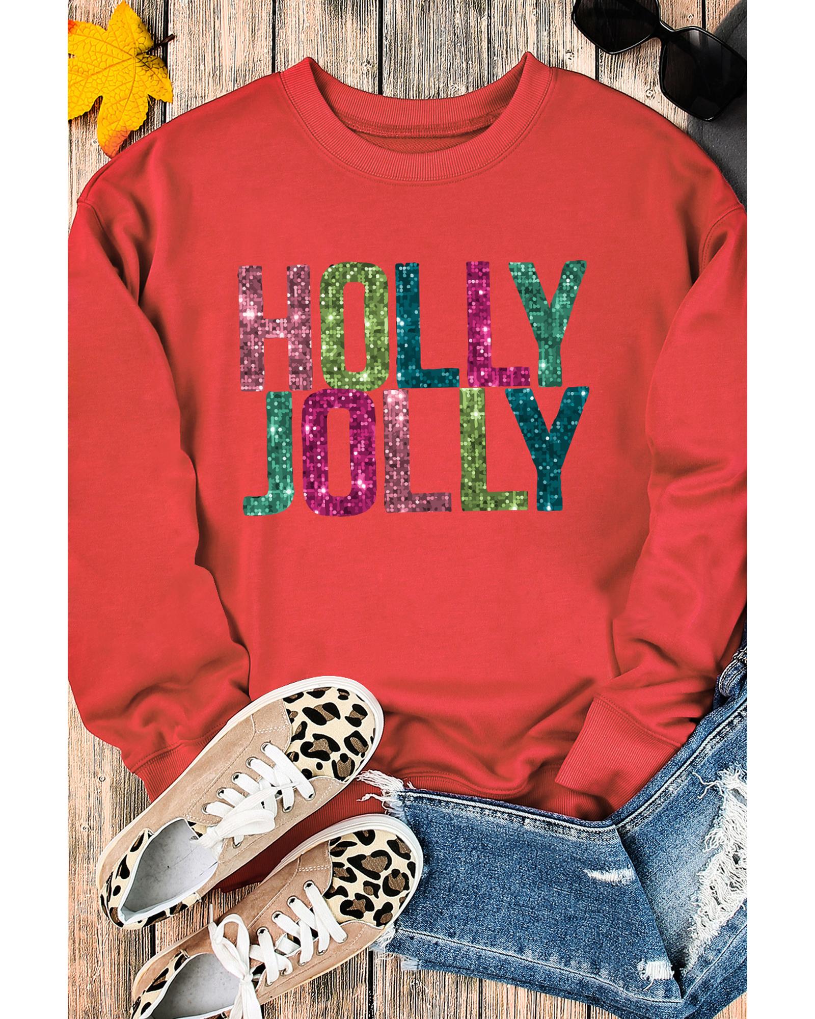 Red Heat Transfer HOLLY JOLLY Printing Christmas Pullover Sweatshirt – L