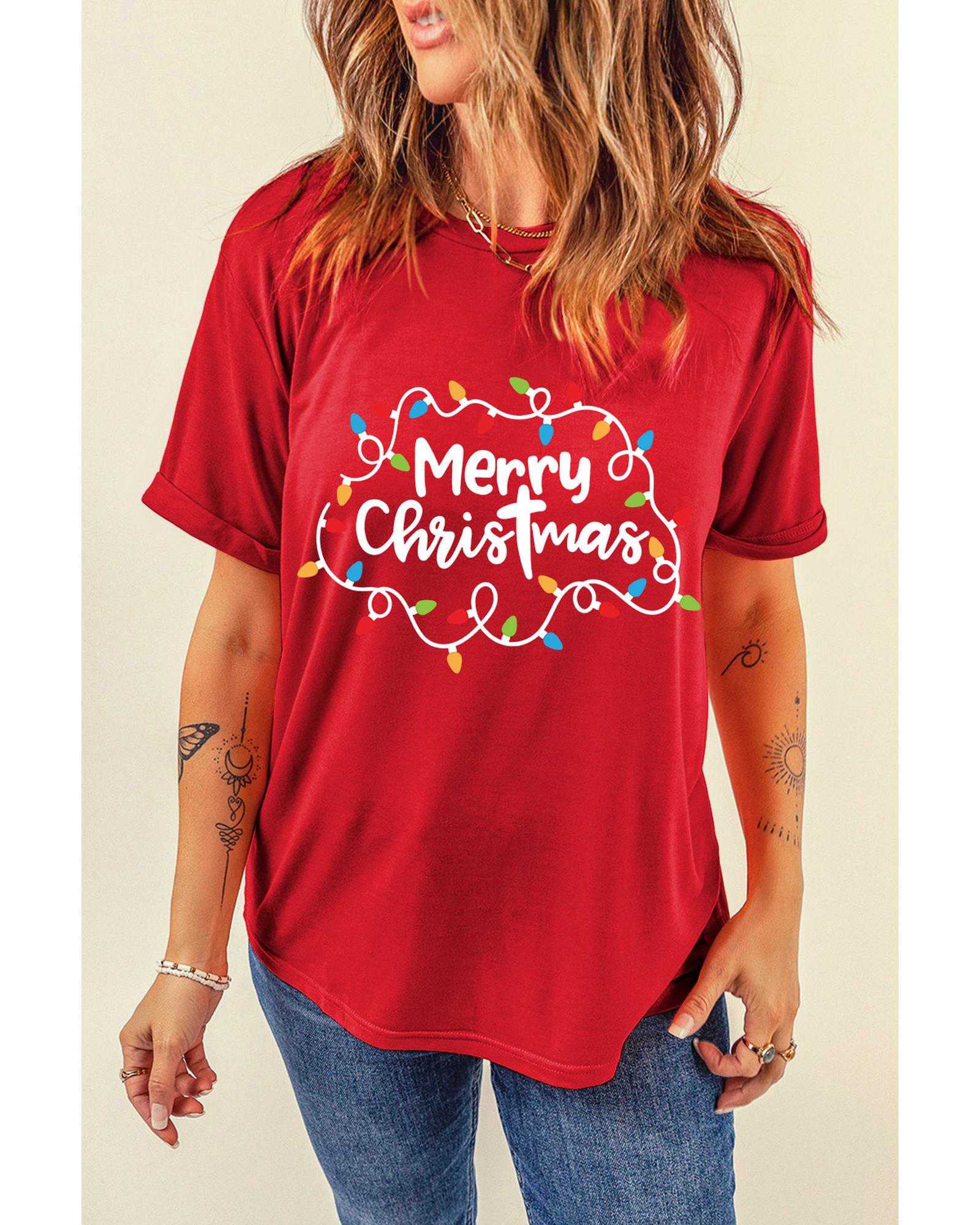 • Red Merry Christmas Lights Print Crew Neck T