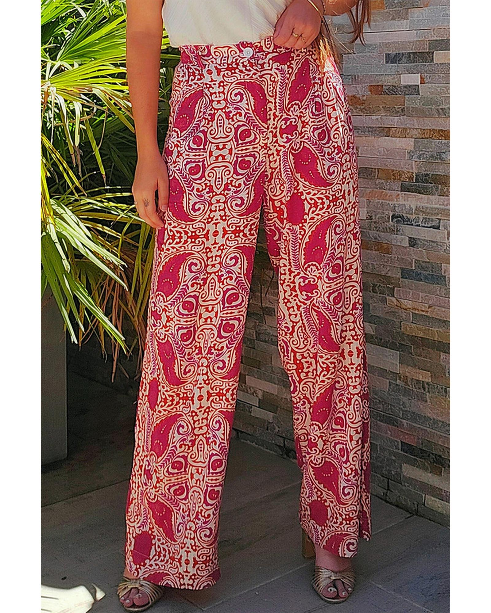 Red Paisley Printed Buttoned High Waist Straight Leg Pants – S
