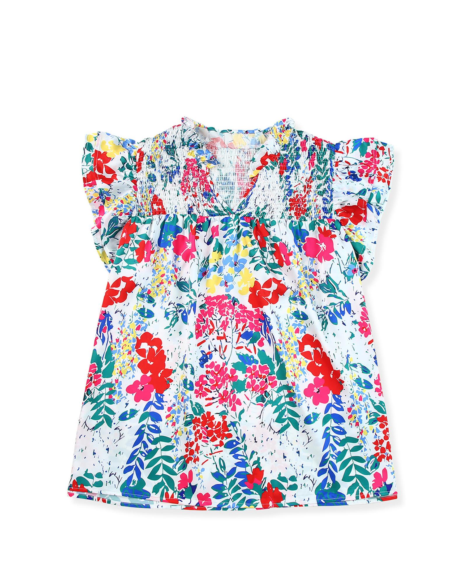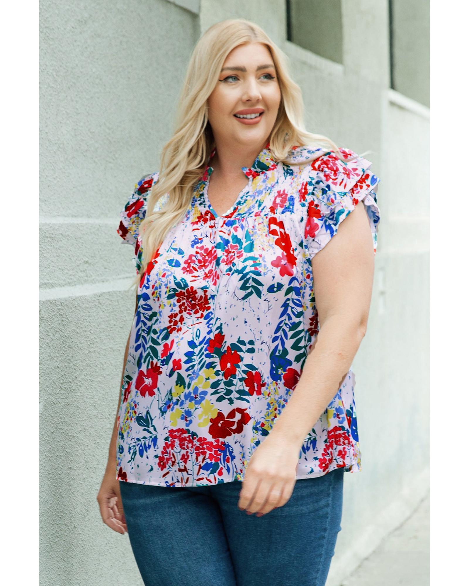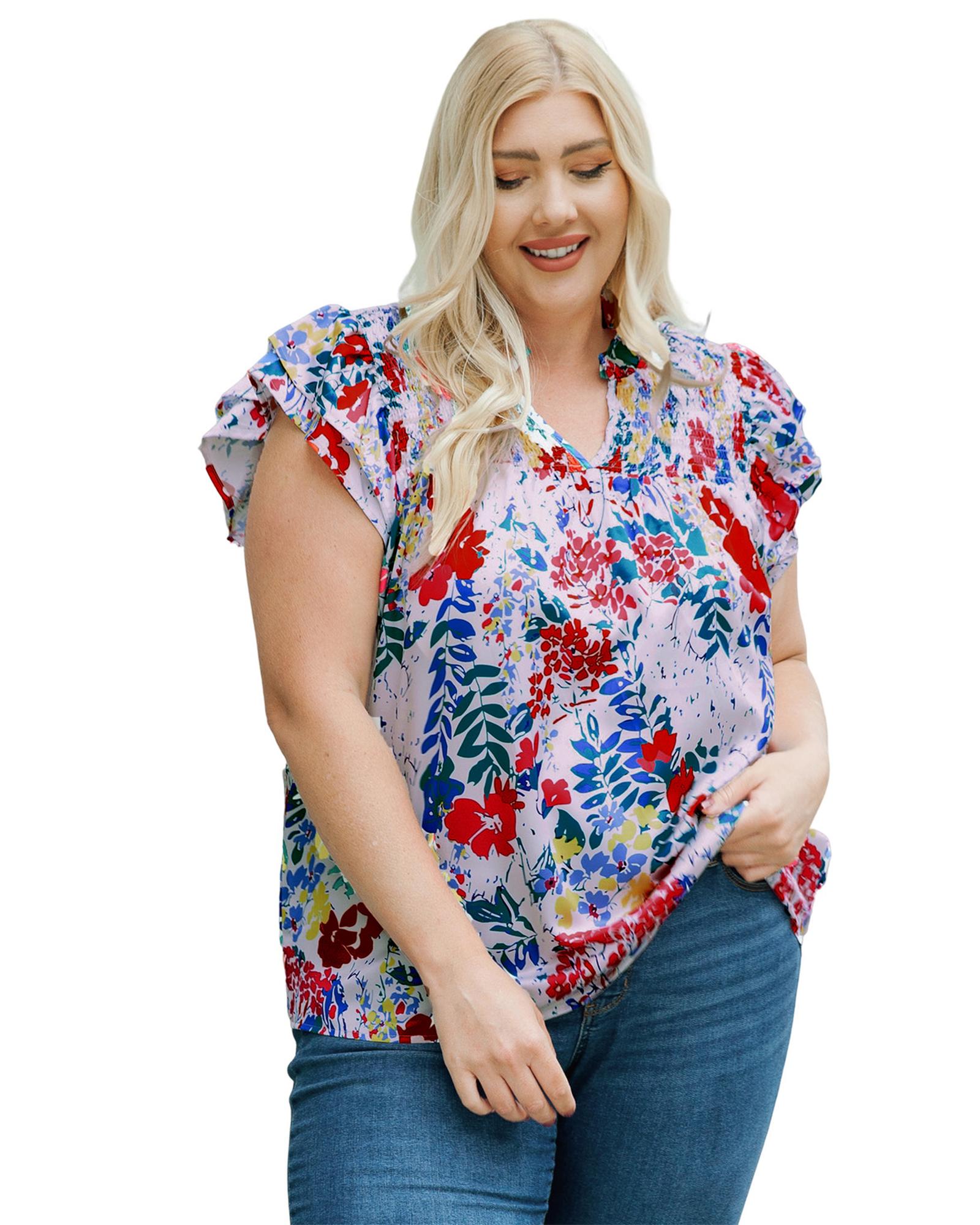 Red Plus Floral Print Ruffle Cap Sleeve V Neck Blouse – 1X