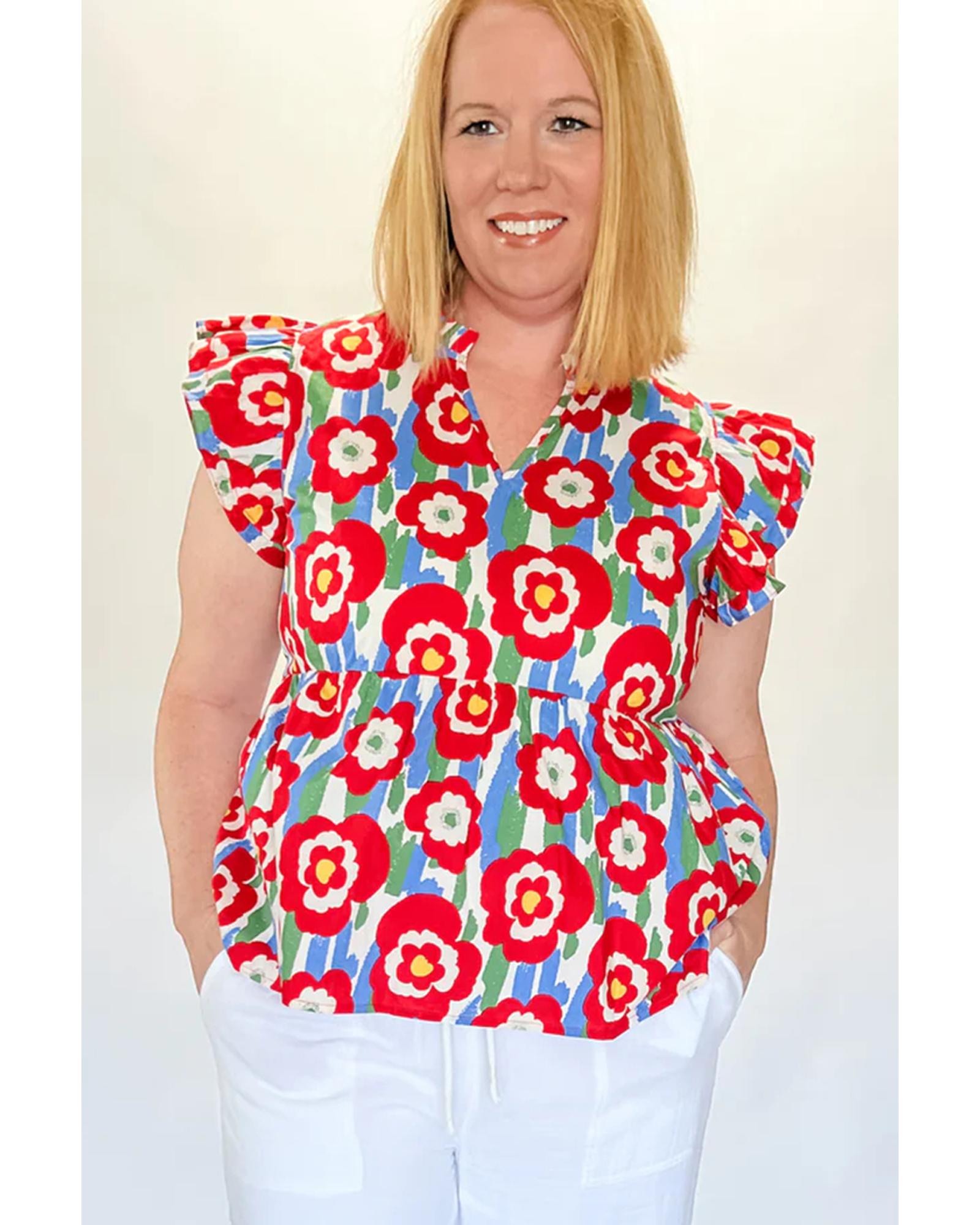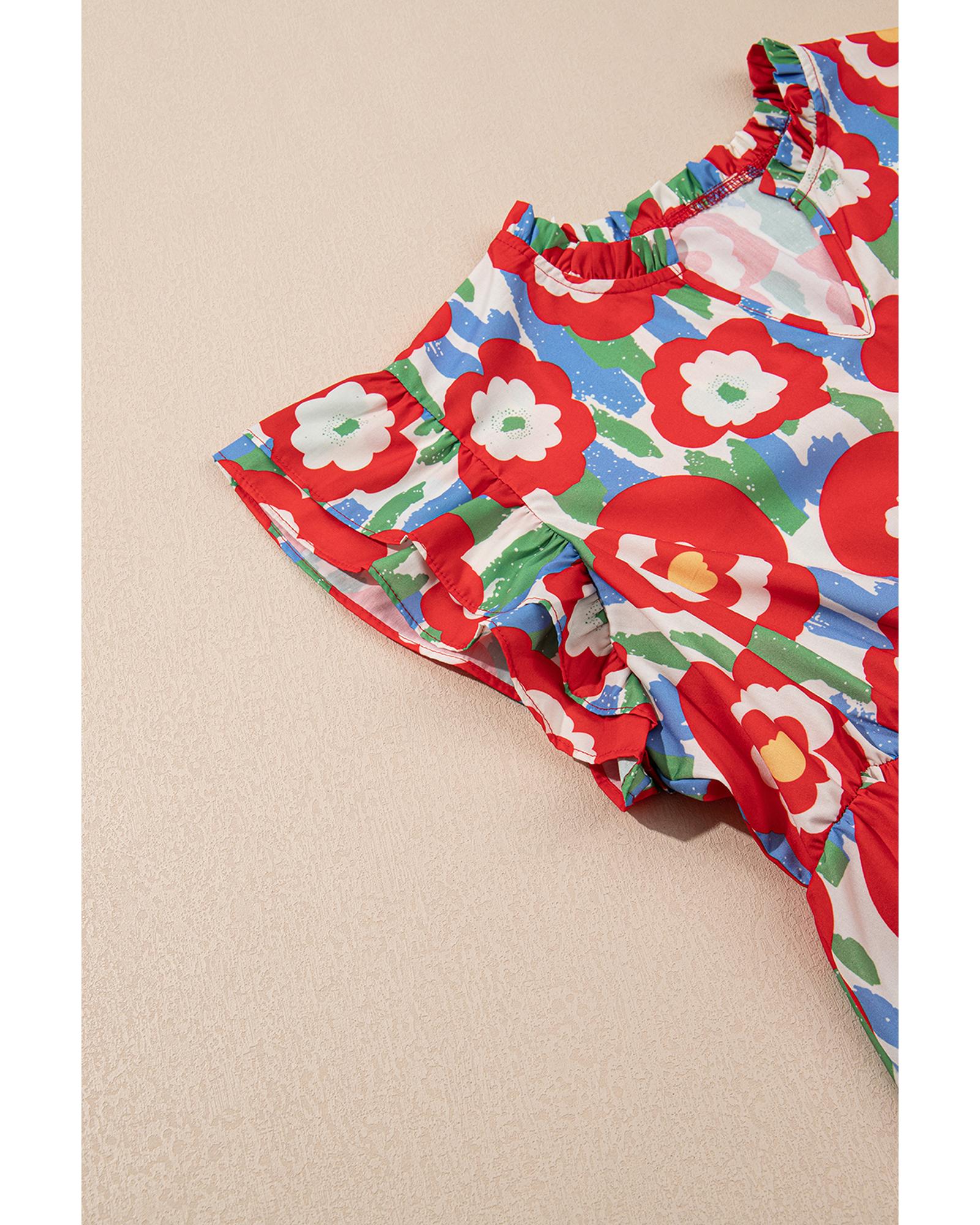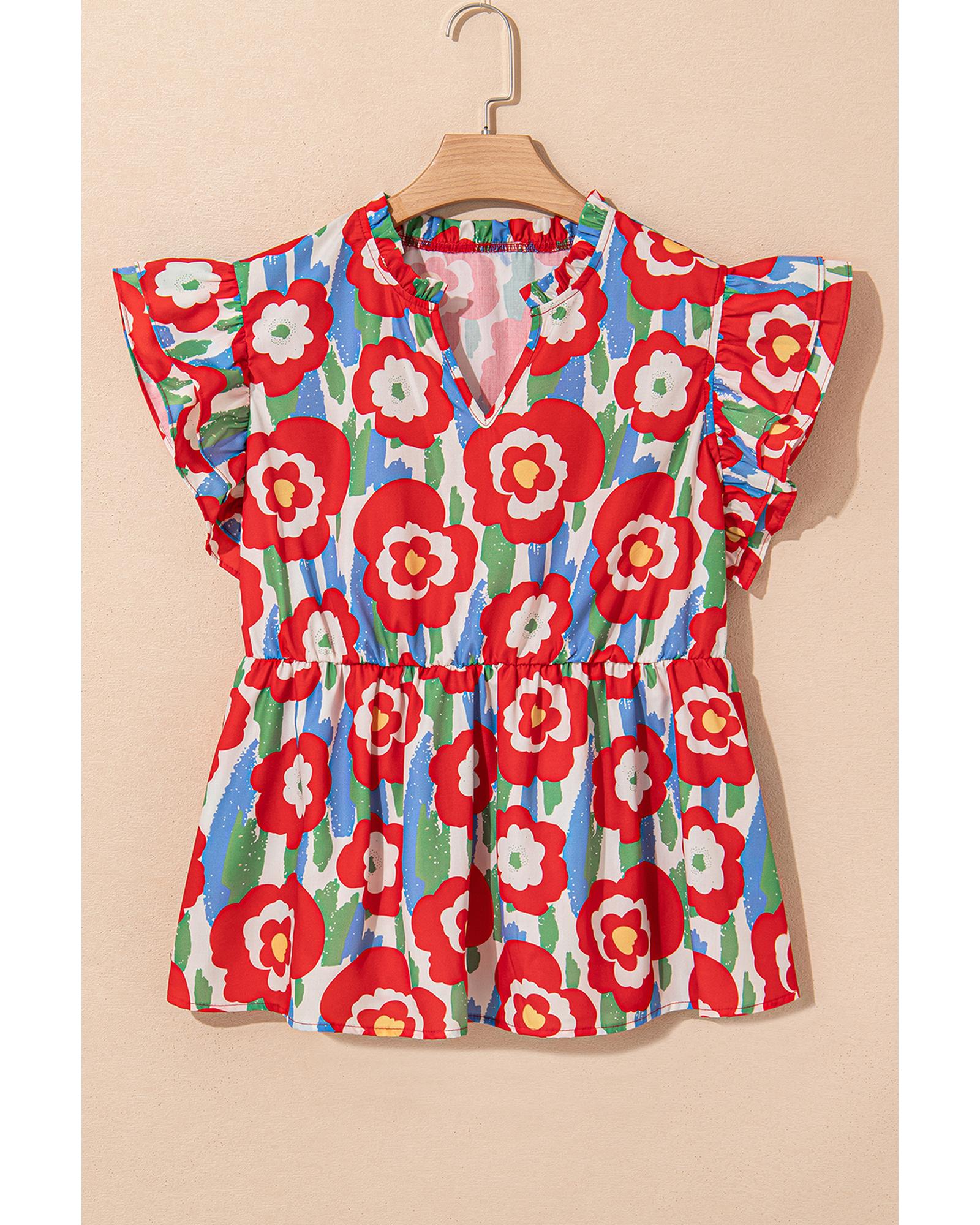 Red Plus Size Floral Print Ruffle Trim Split Neck Peplum Top – 3X