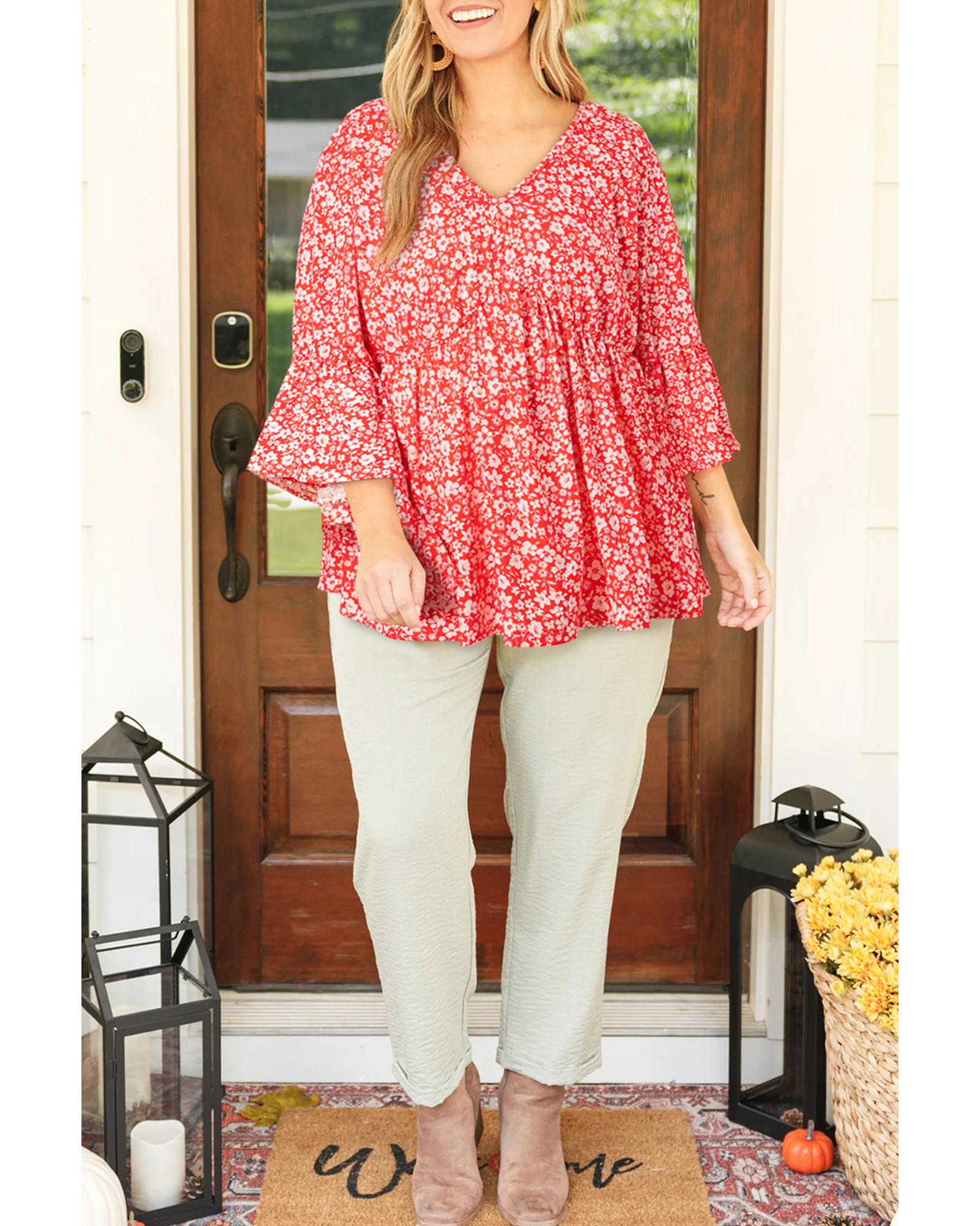 Red Plus Size Floral V Neck Flared Bracelet Sleeve Blouse – 1X