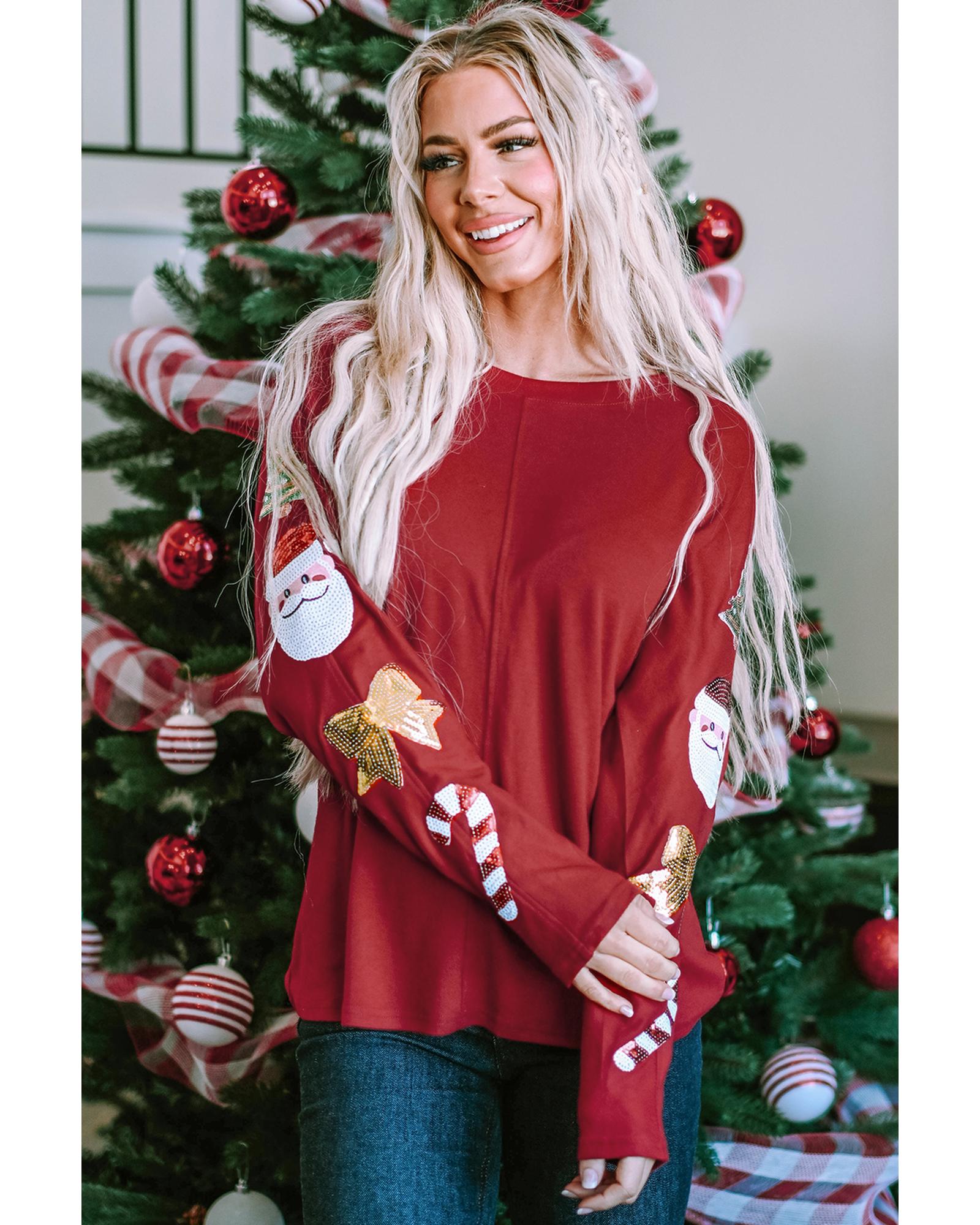 Red Sequined Christmas Favor Sleeve Casual Pullover – L