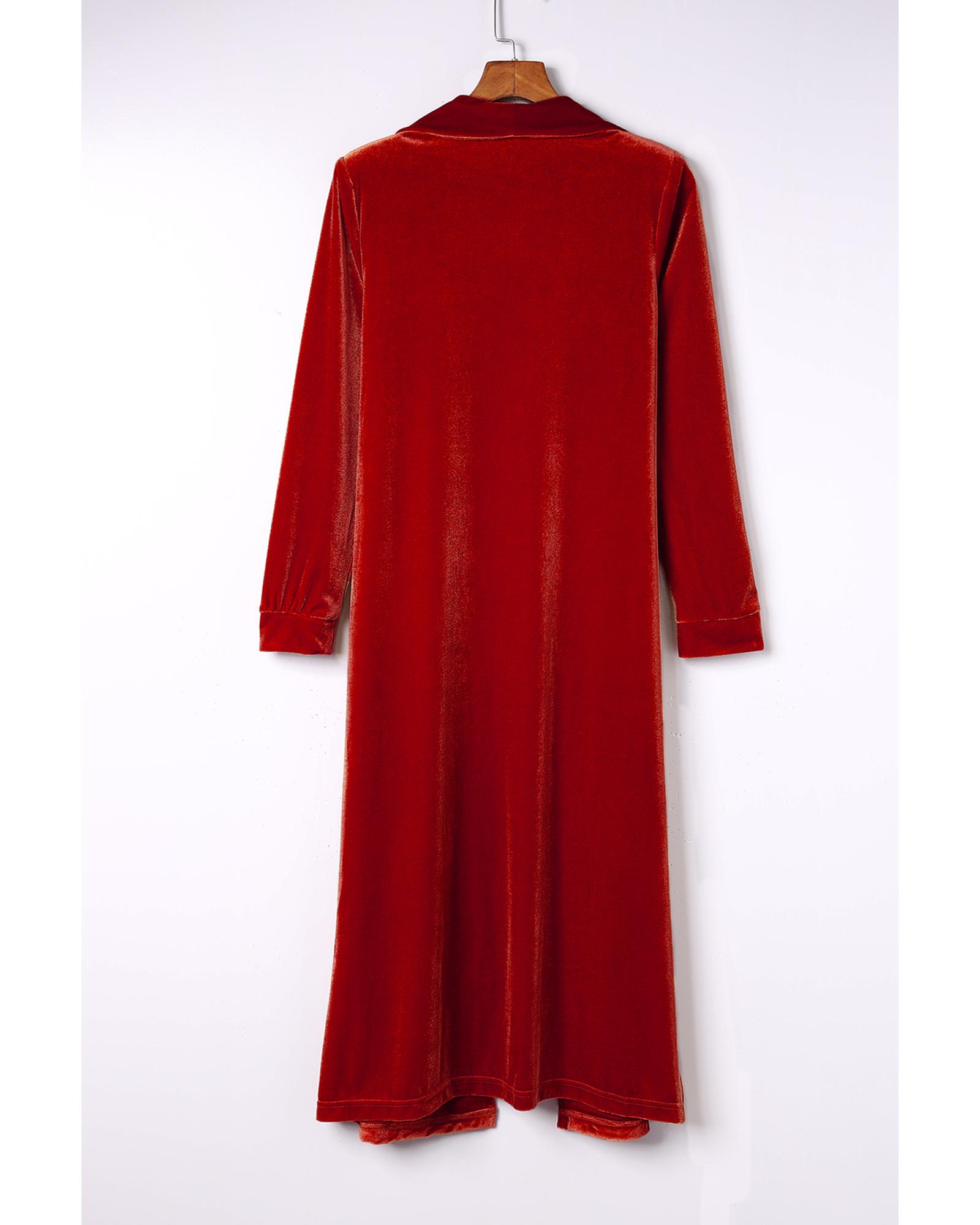 Red Velvet Open Front Pocketed Long Duster – S