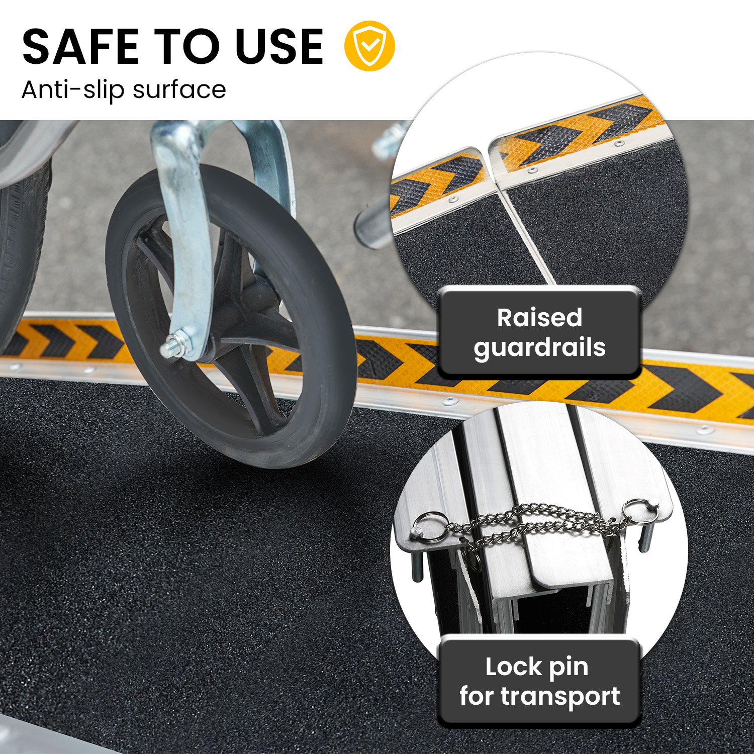 This portable aluminium wheelchair ramp is the ideal solution for climbing steps and kerbs or for getting into your vehicle. Its four-way folding design means you can carry it like a suitcase allowing for easy transportation, storage and usage both outdoors and at home.
