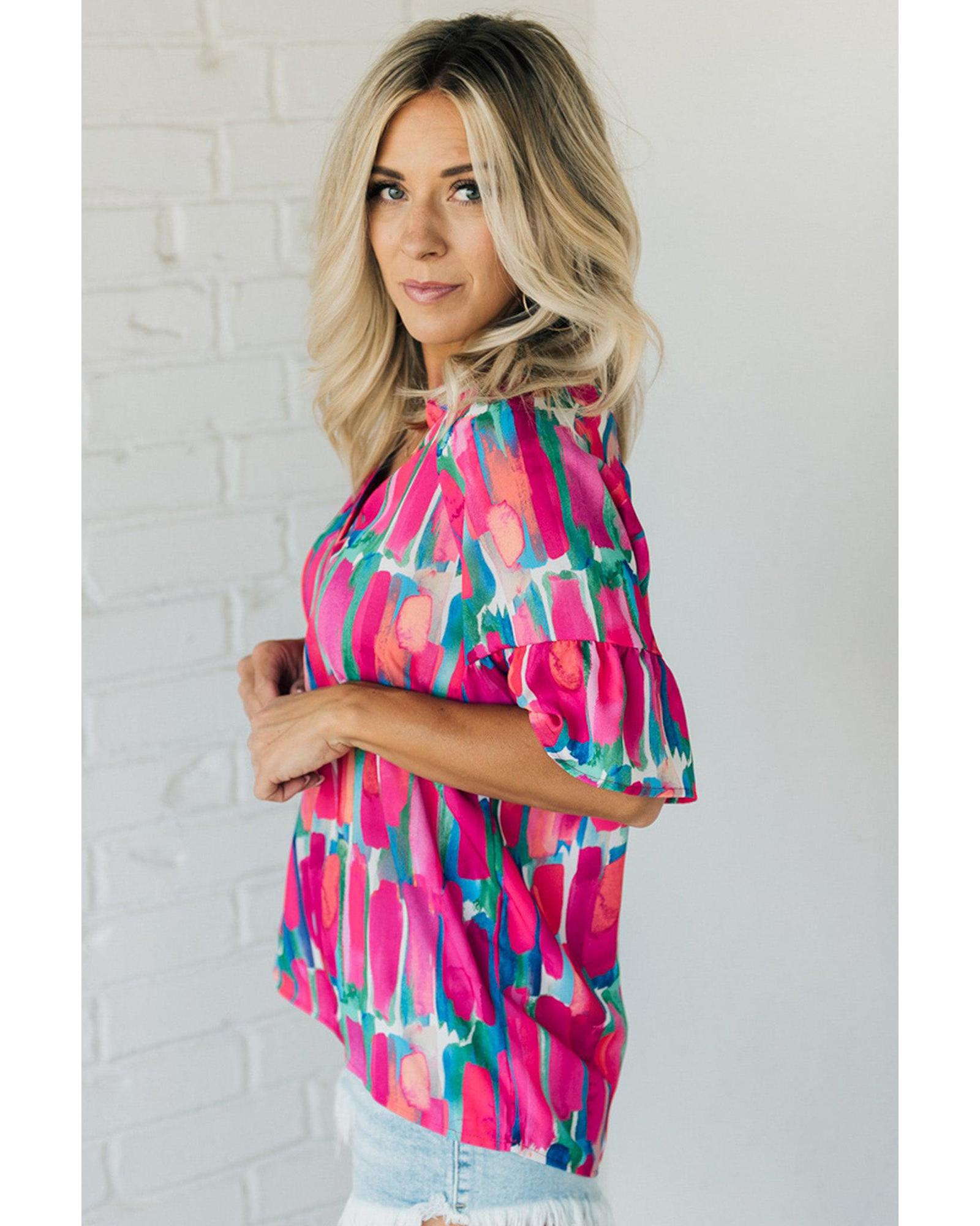 Rose Abstract Brushwork Print Buttoned V Neck Blouse – L