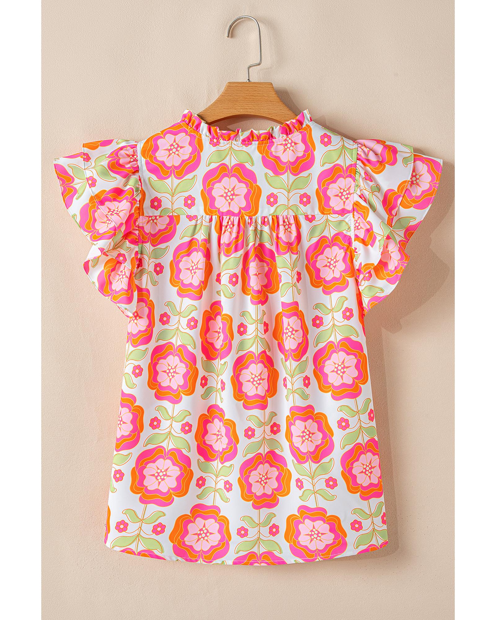 Rose Floral Ruffled Sleeve Ric-rac Trim Split Neck Loose Blouse – XL