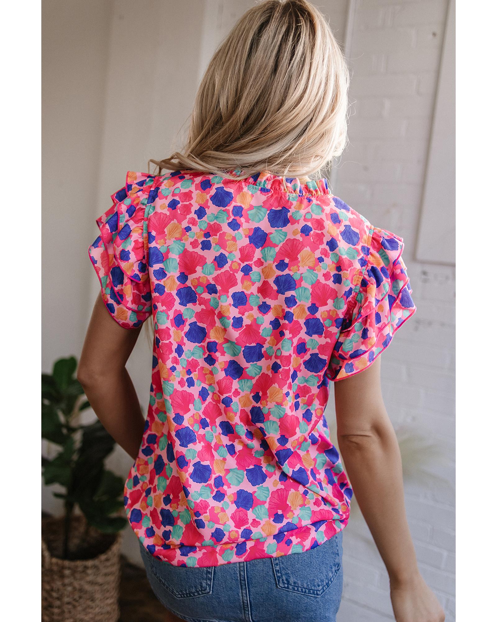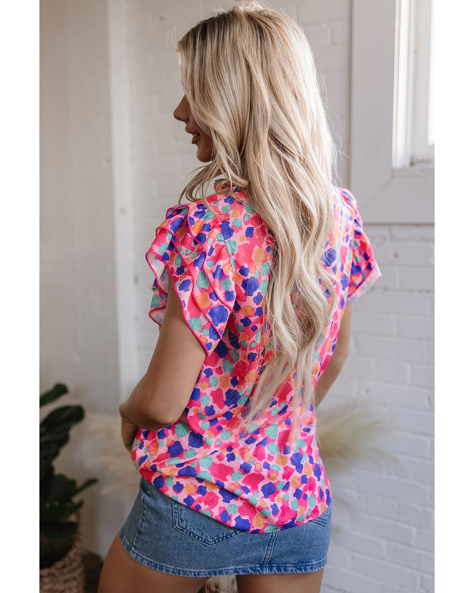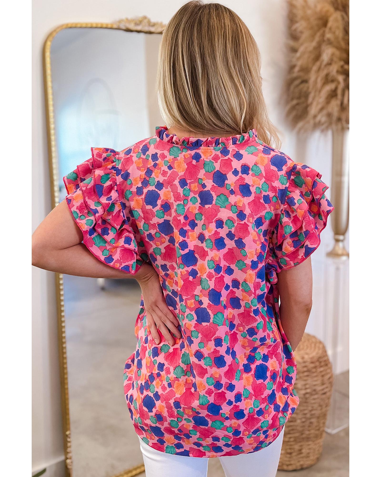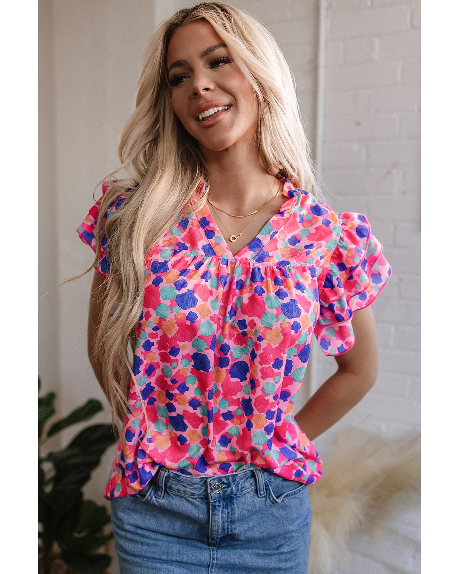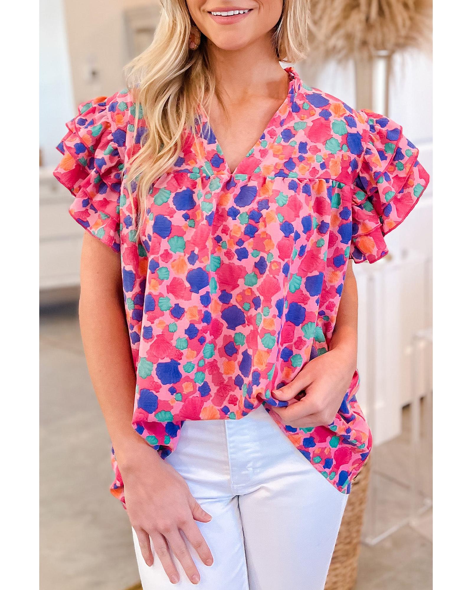 Rose Red Abstract Print Ruffled Sleeve V Neck Blouse – M