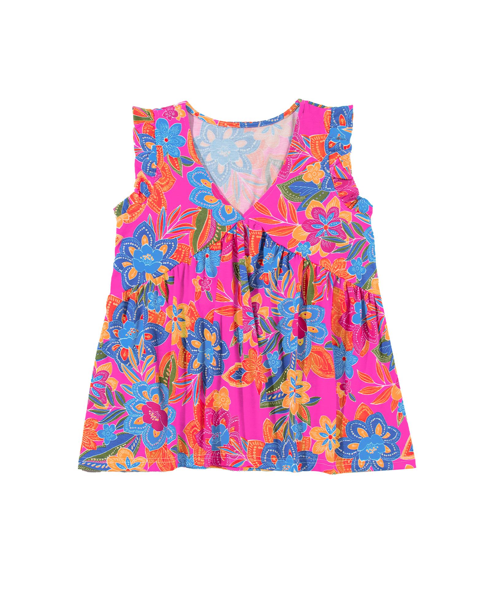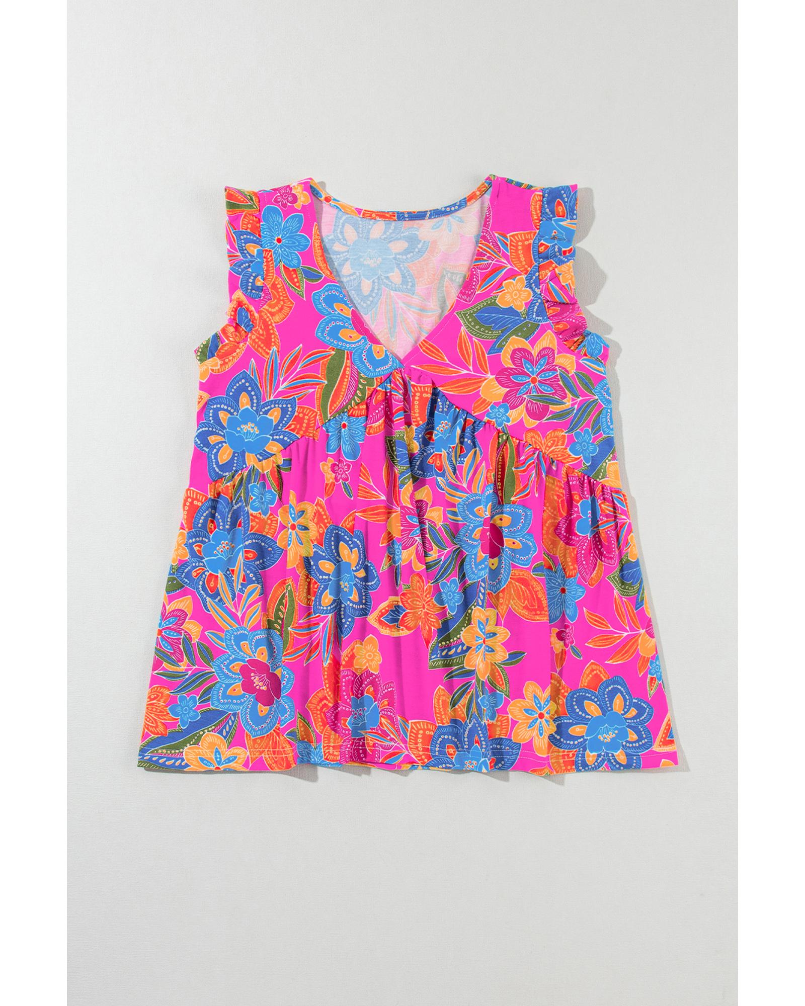 Rose Red Boho Pattern Print Flounce V Neck Tank Top – M