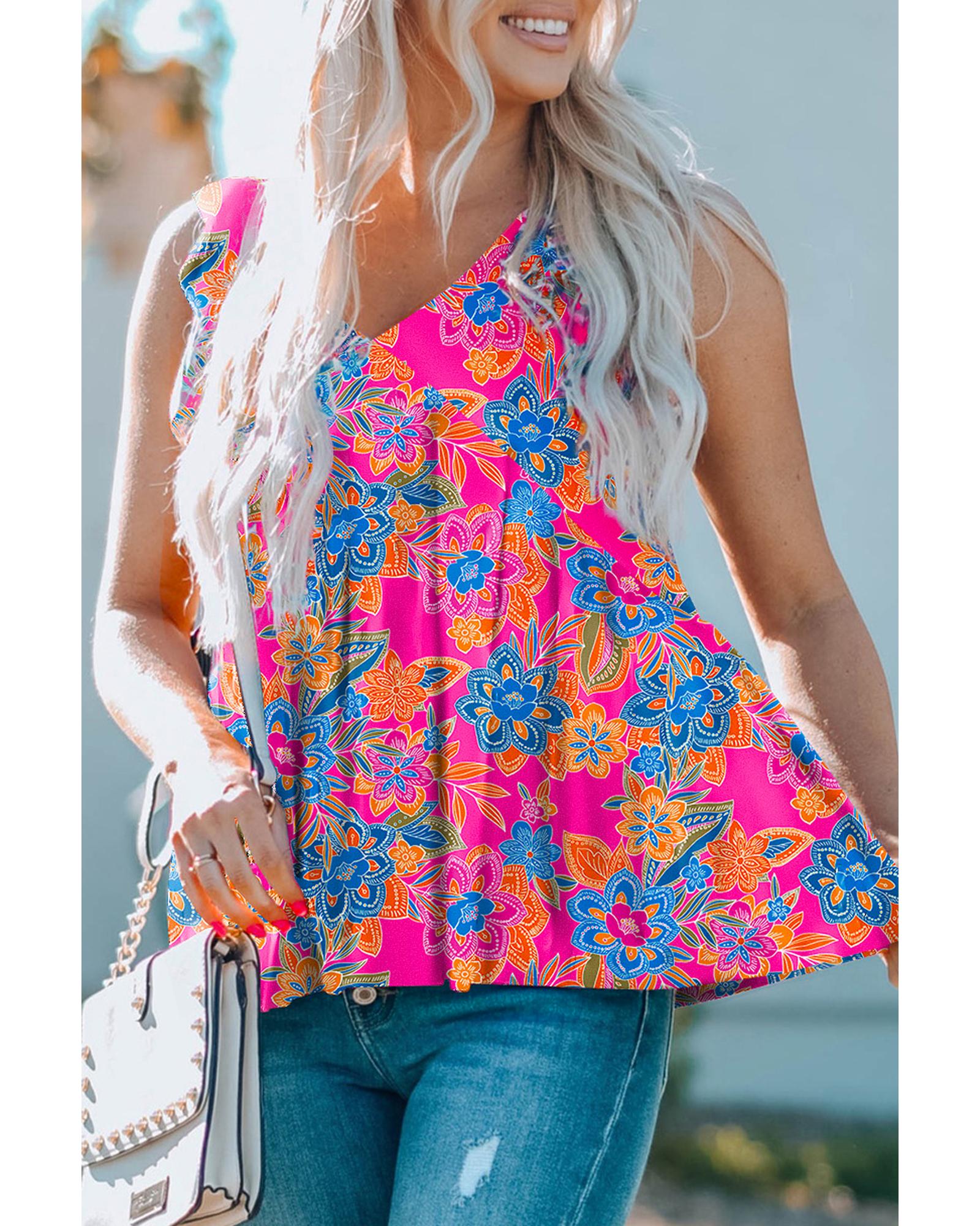 Rose Red Boho Pattern Print Flounce V Neck Tank Top – S