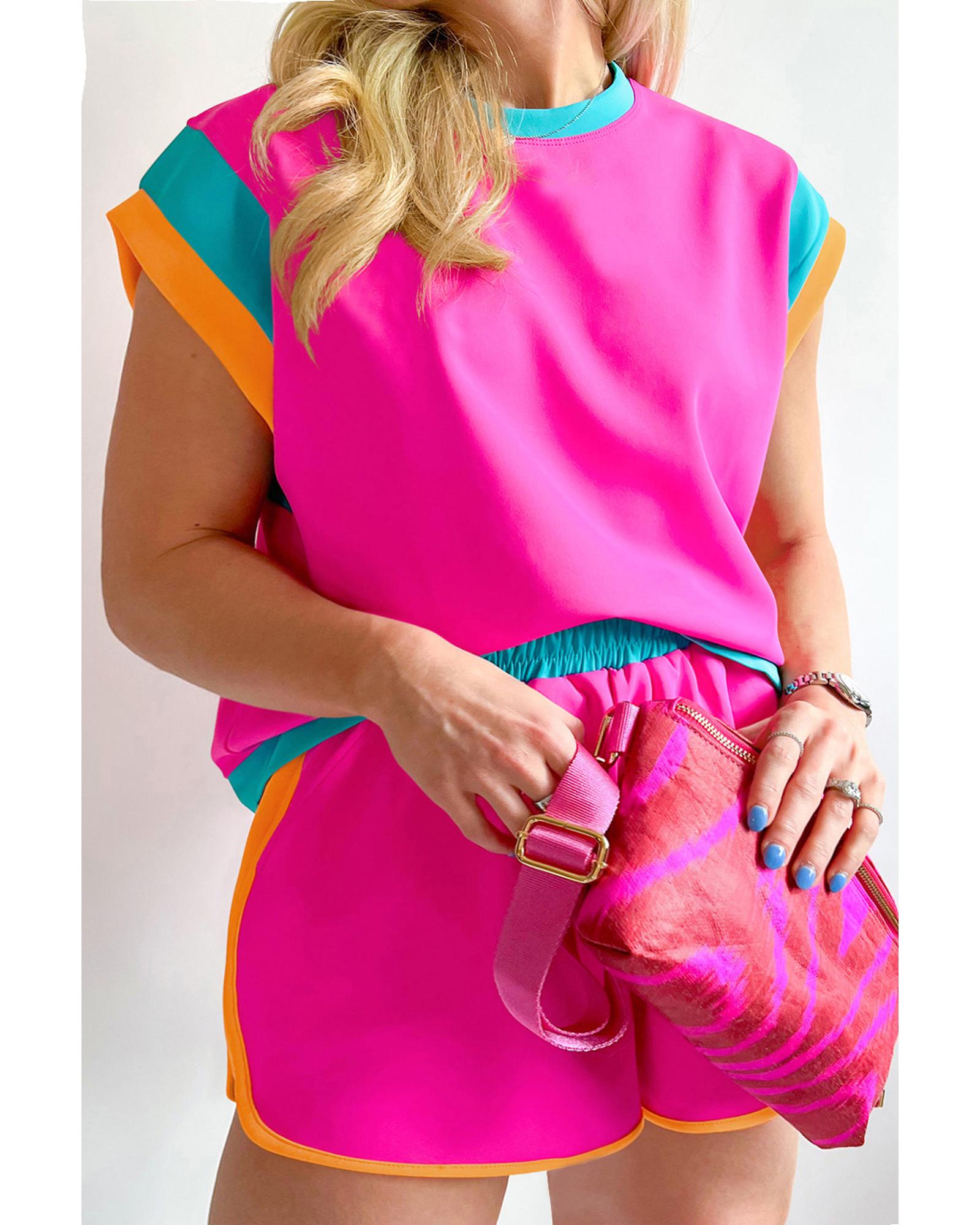• Cap sleeve top and shorts with colorblock pattern