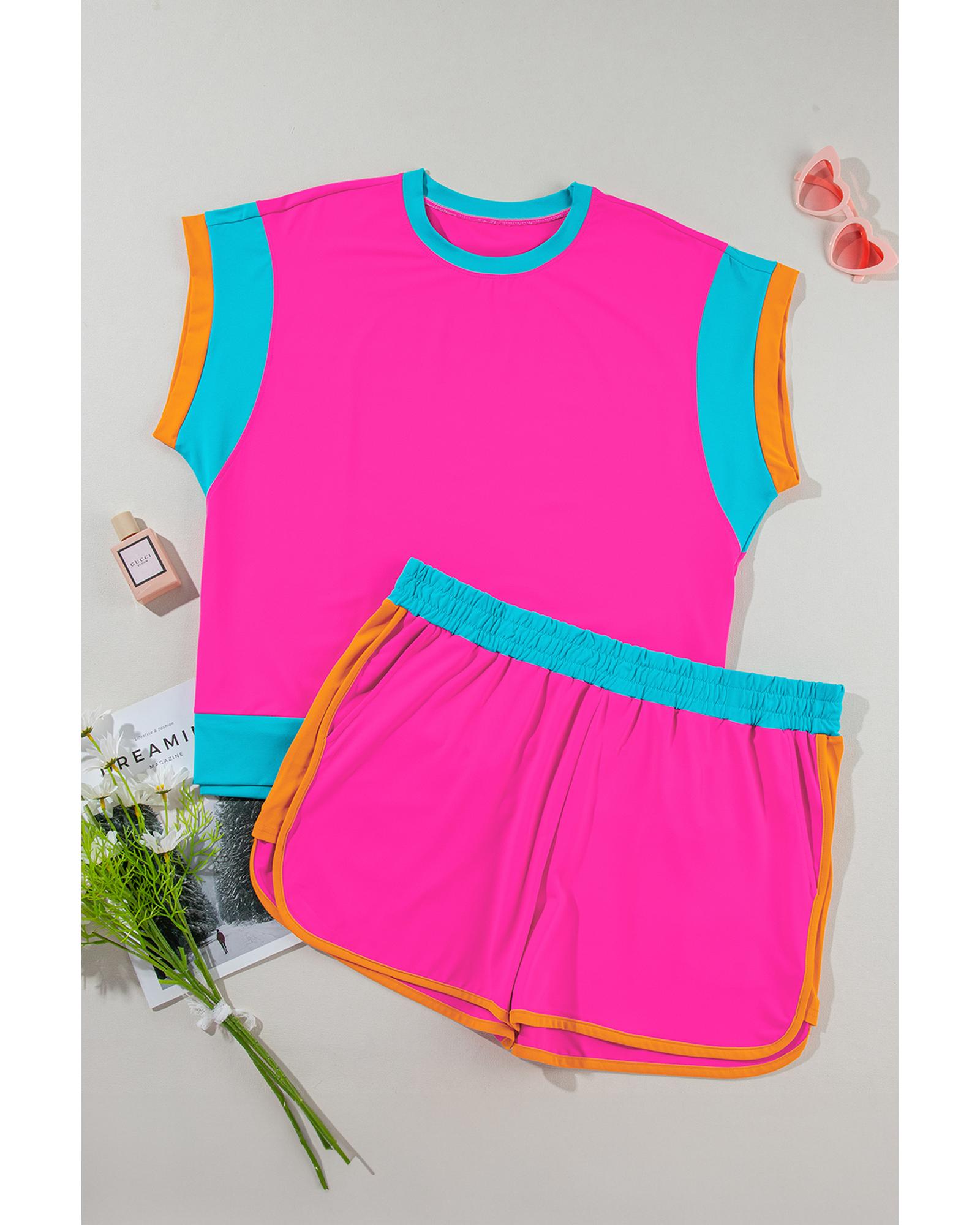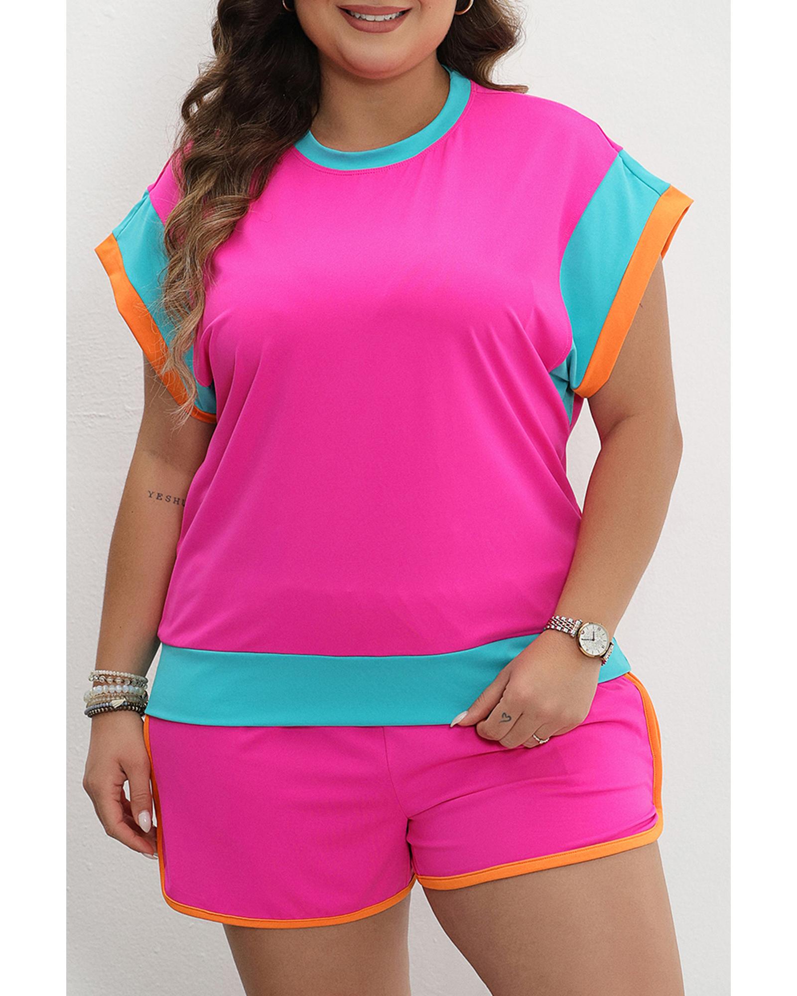 Rose Red Colorblock Patchwork Cap Sleeve Top Plus Size Shorts Set - 1X Original price was: $70.99.Current price is: $37.99.