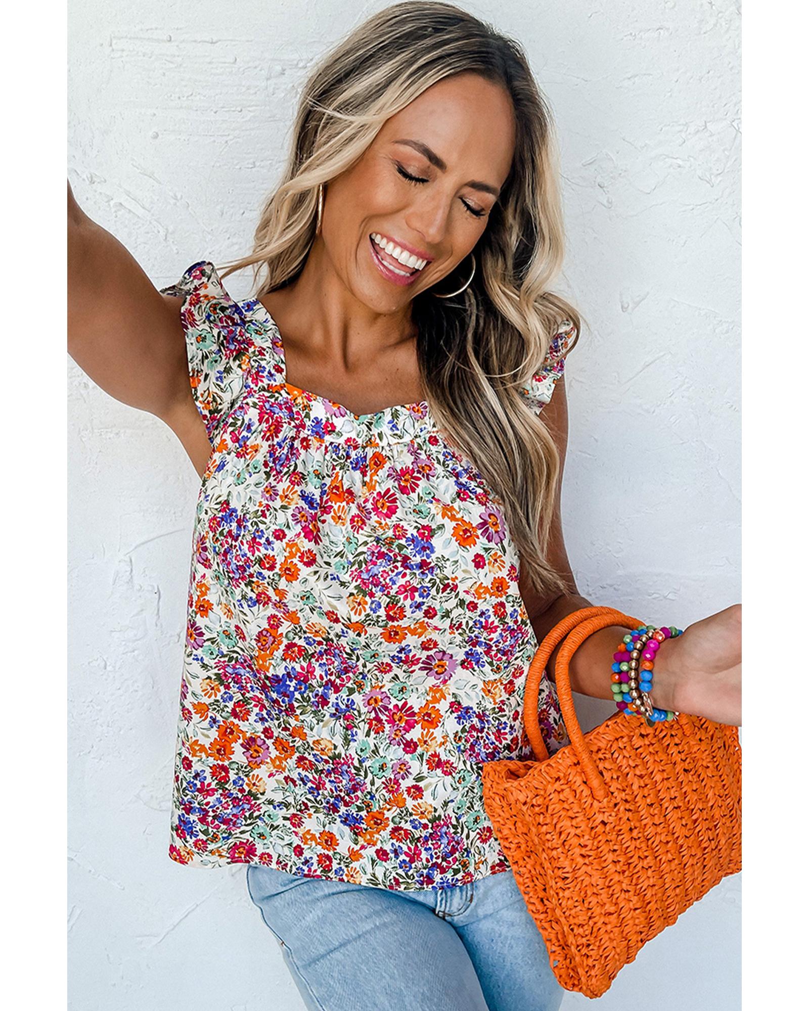 Rose Red Floral Square Neck Flutter Tank Top – M