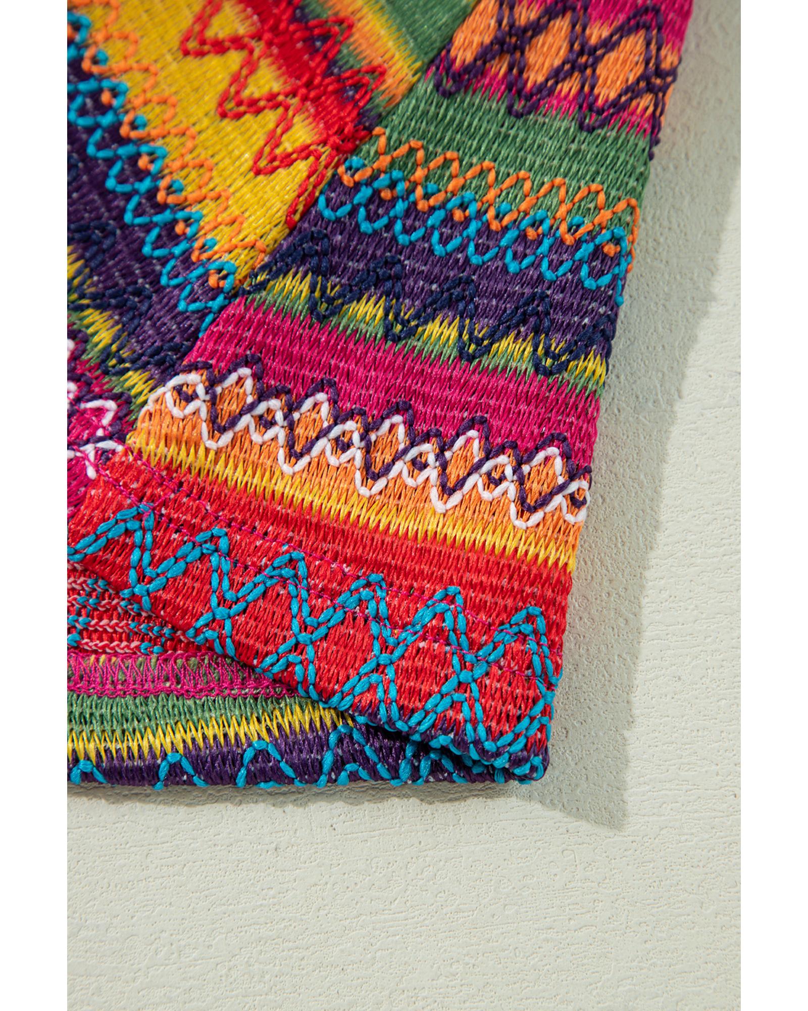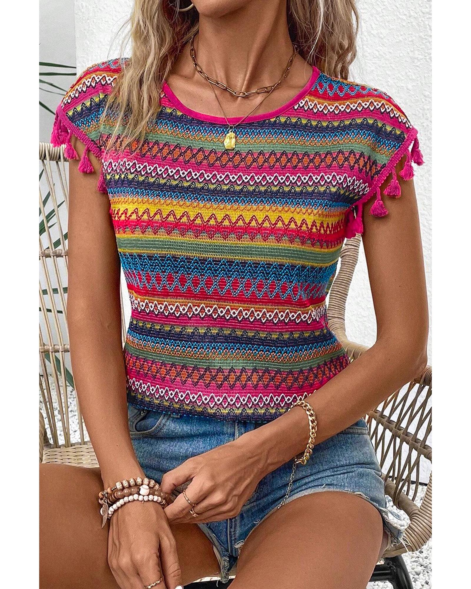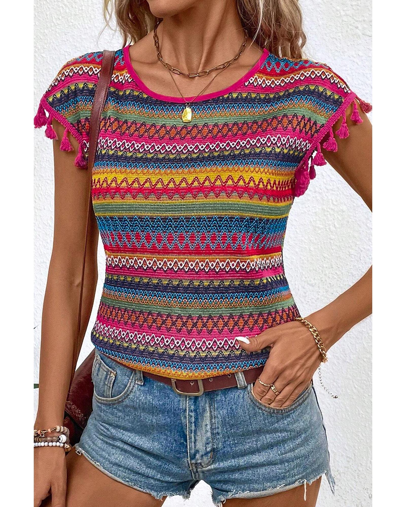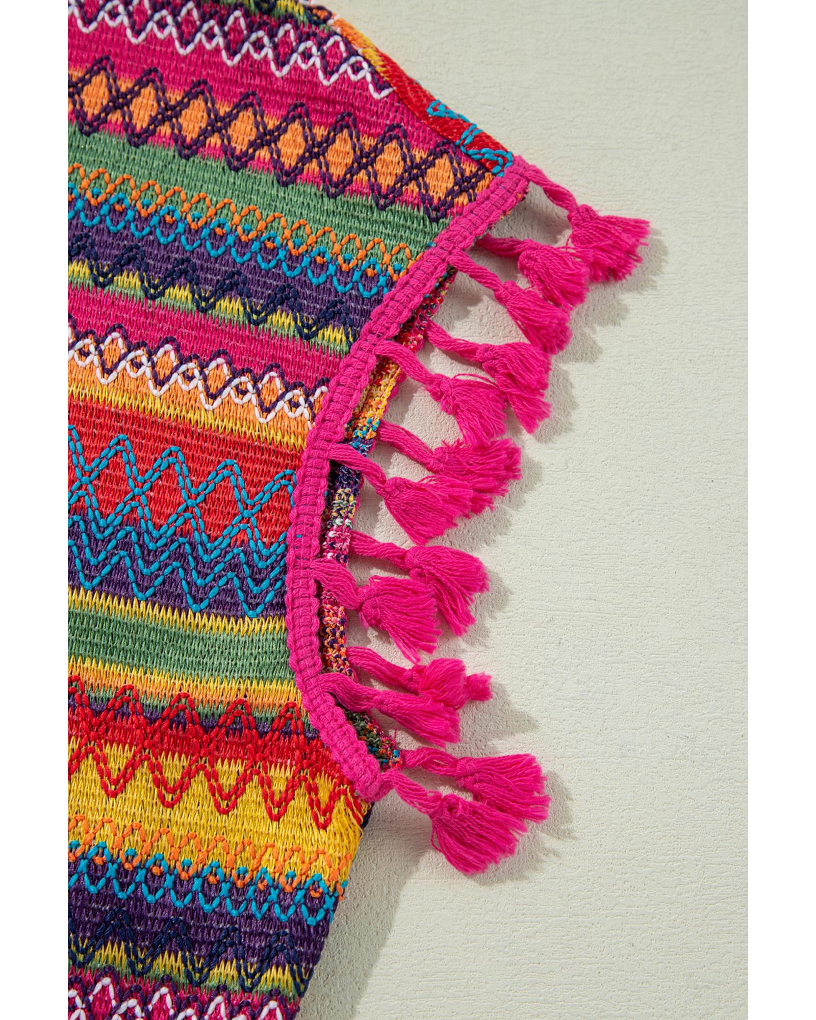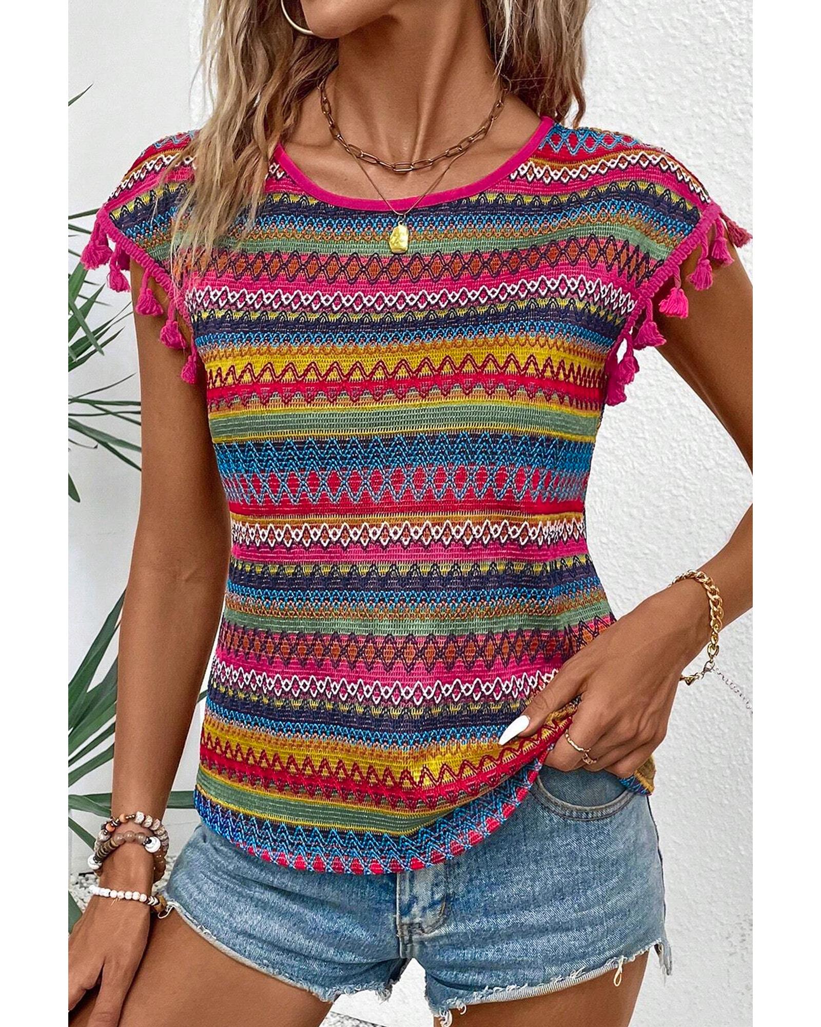 Rose Red Jacquard Textured Tasseled Cap Sleeve Top – L