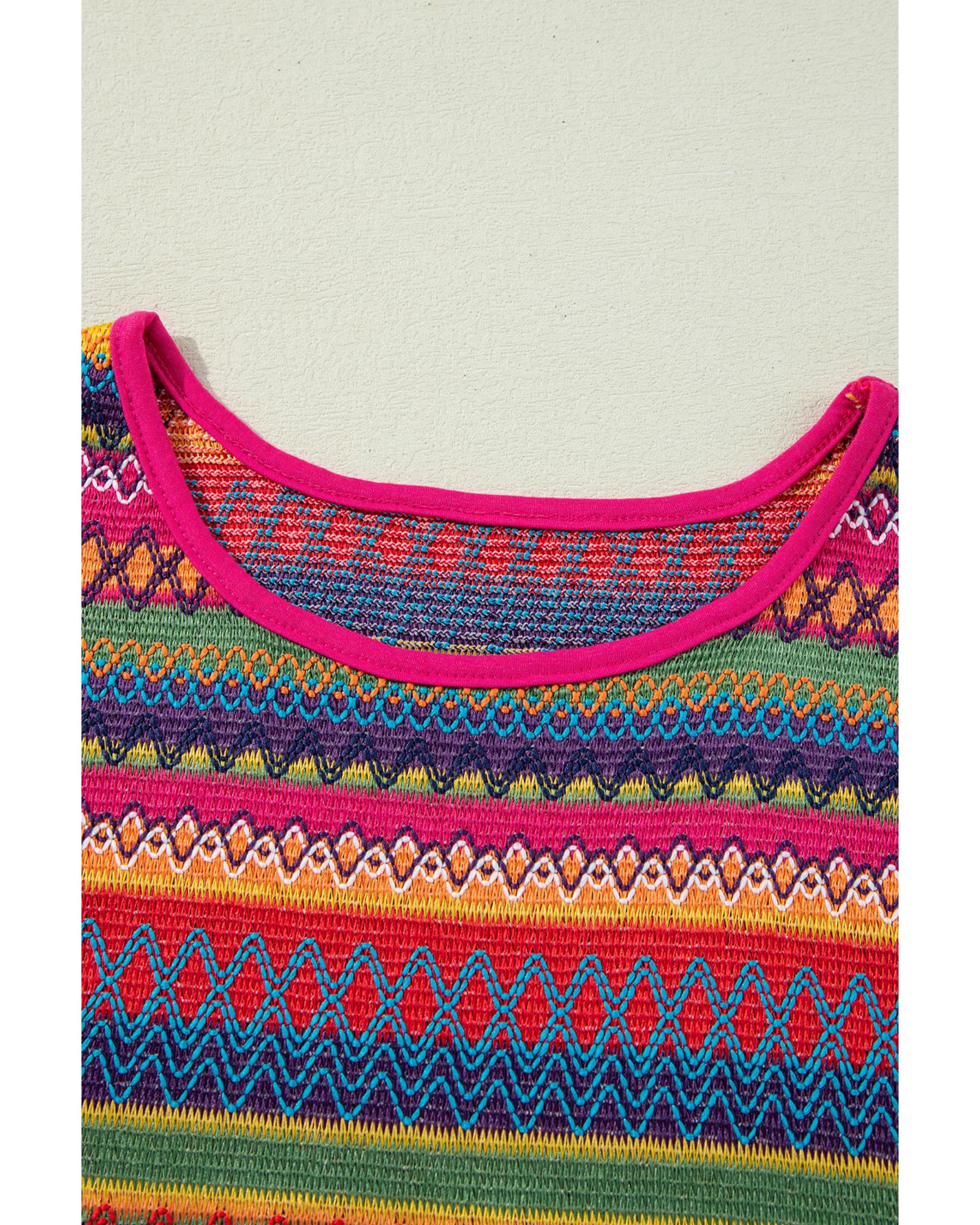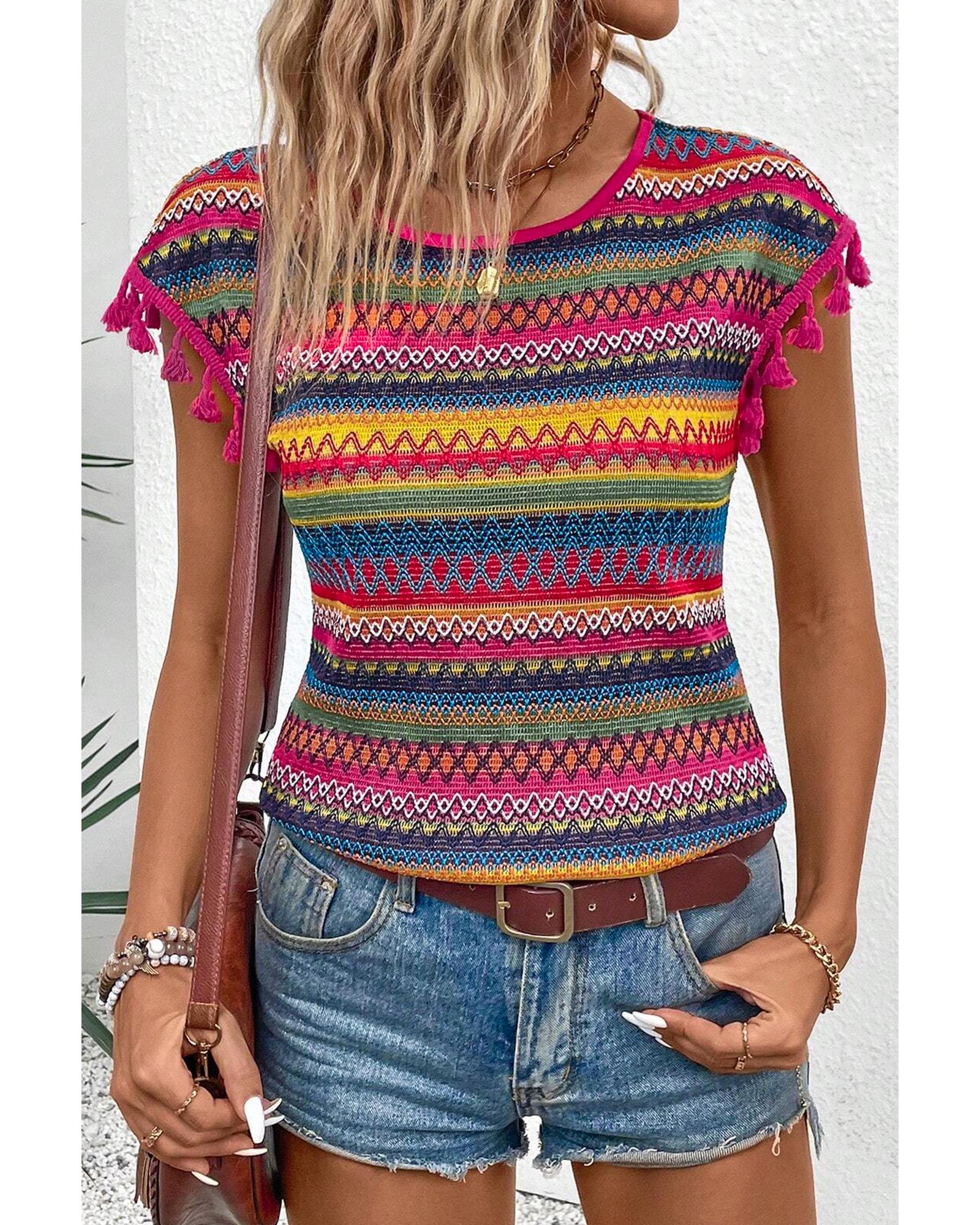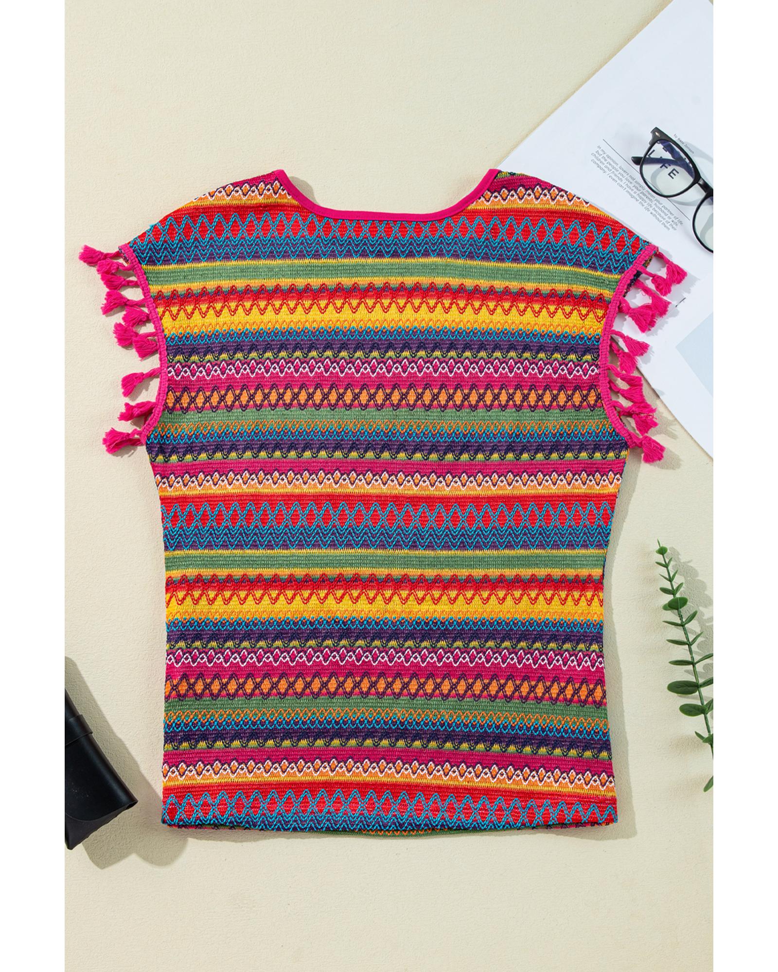 Rose Red Jacquard Textured Tasseled Cap Sleeve Top – M
