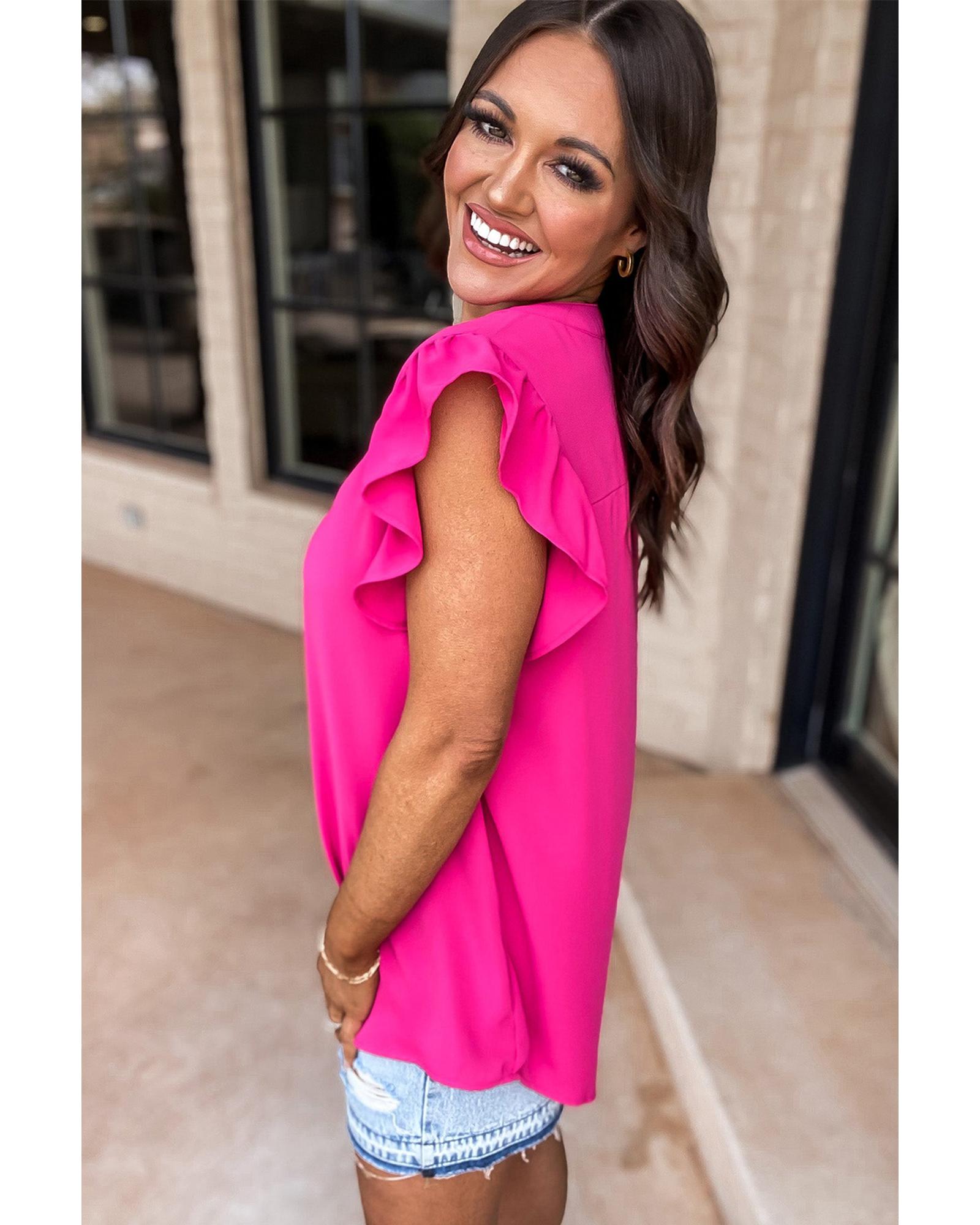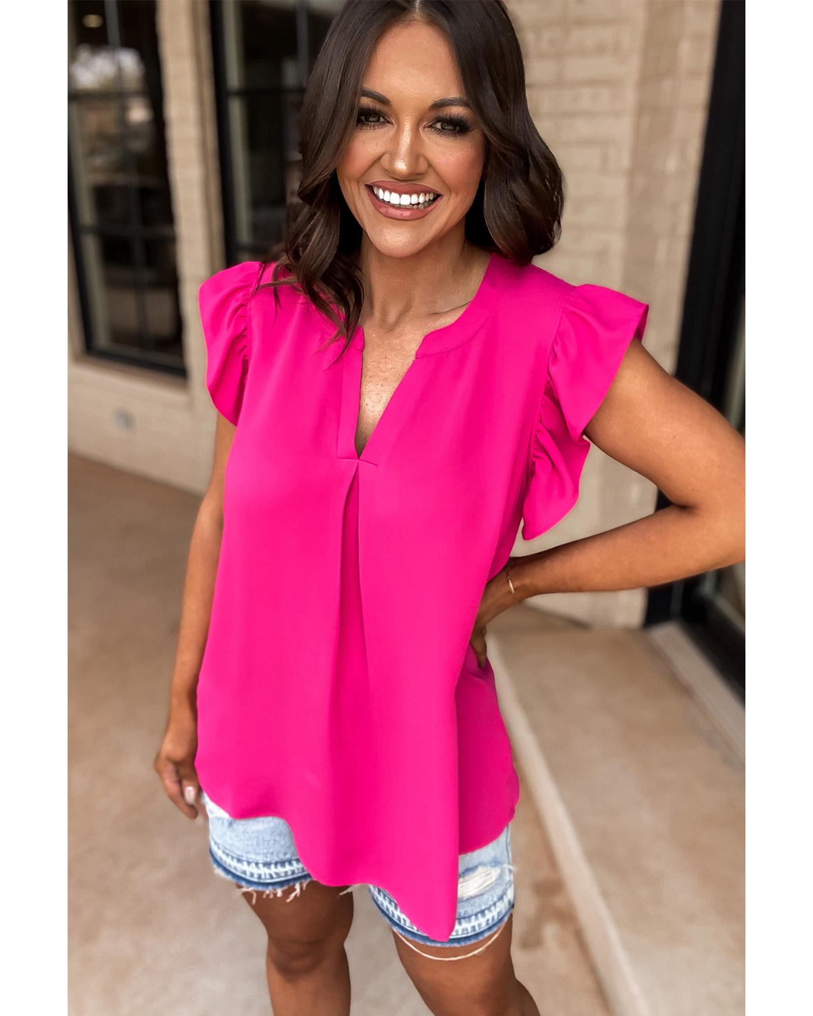 Rose Red Notched Neck Ruffle Sleeve Blouse – S
