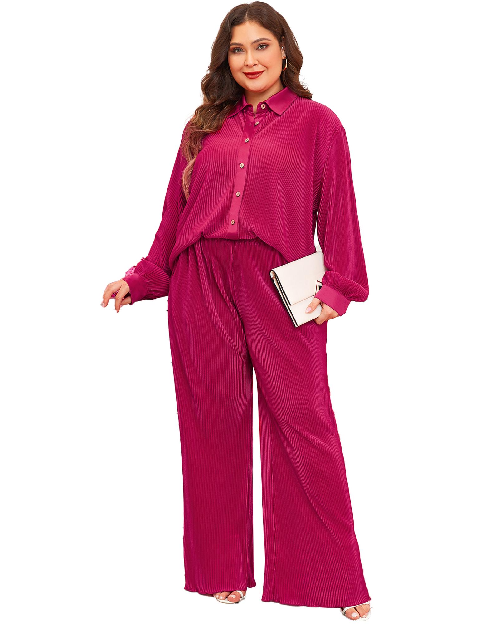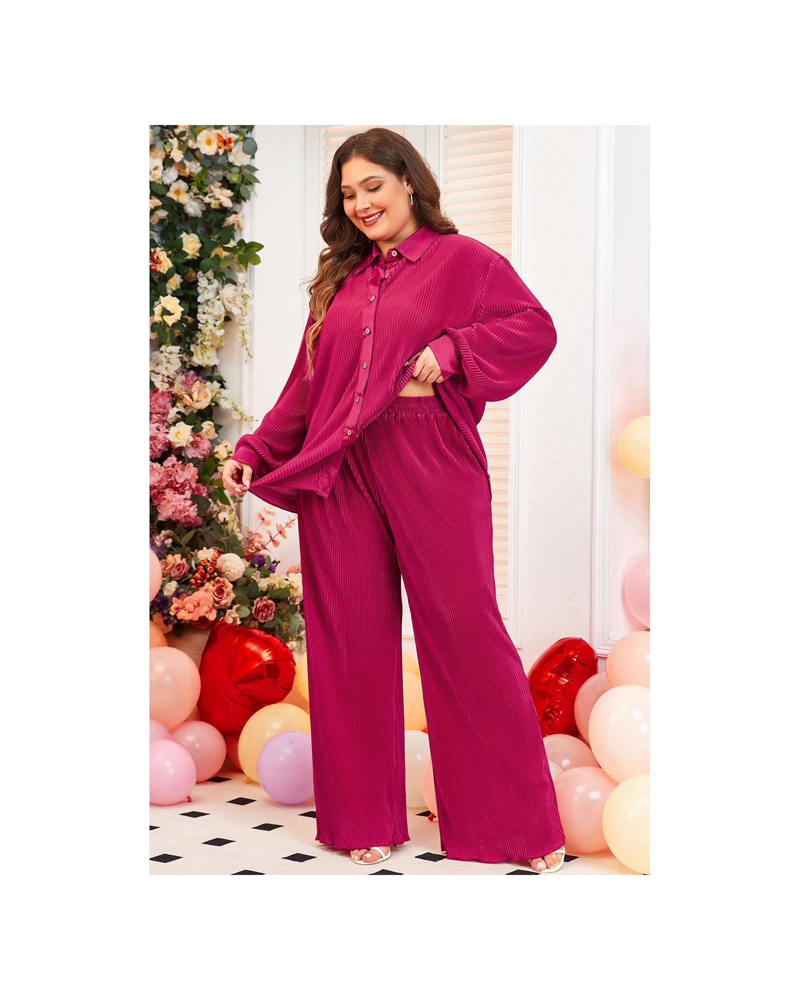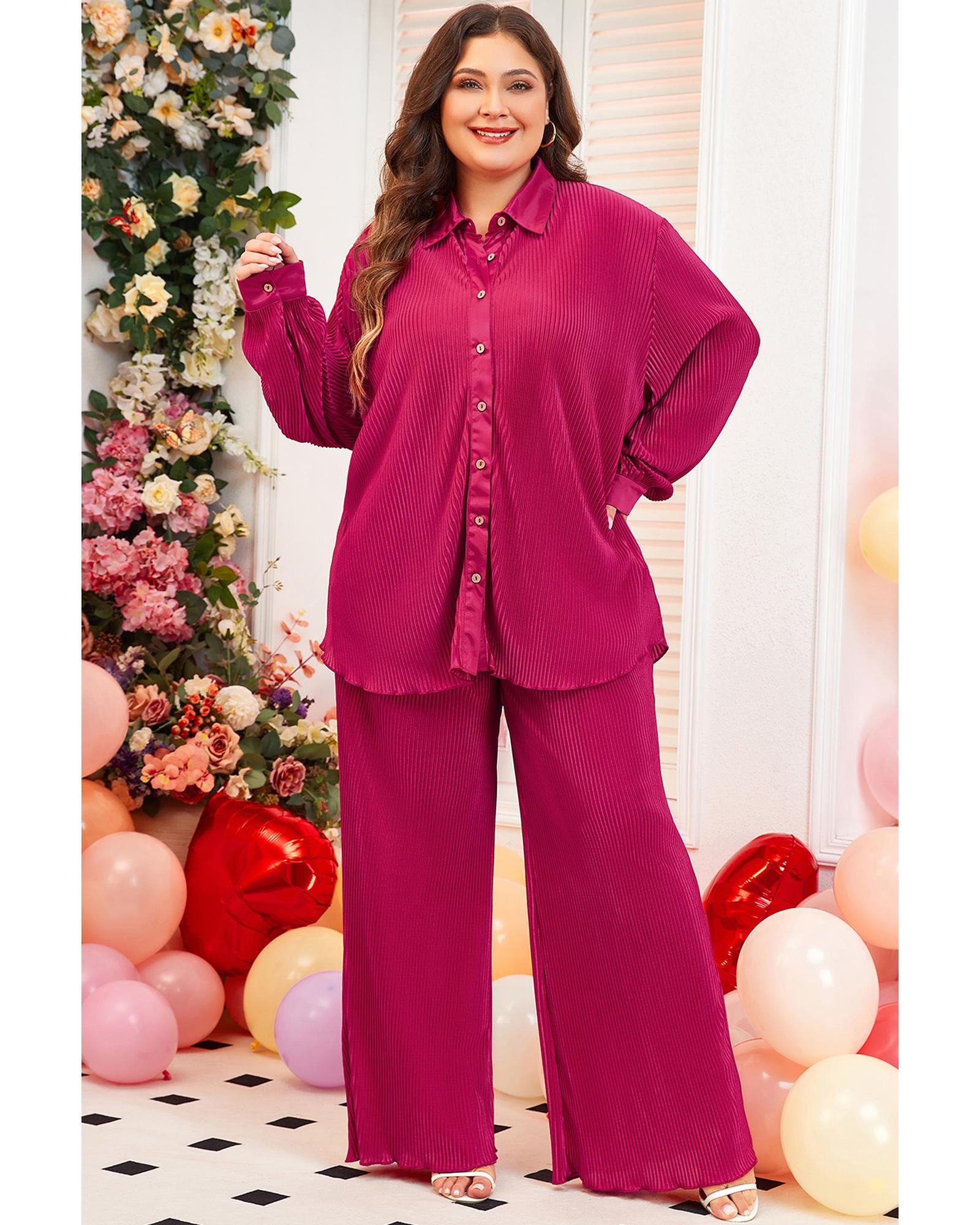 Rose Red Plus Size Ribbed Long Sleeve Shirt and Pants Pajama Set – 3X