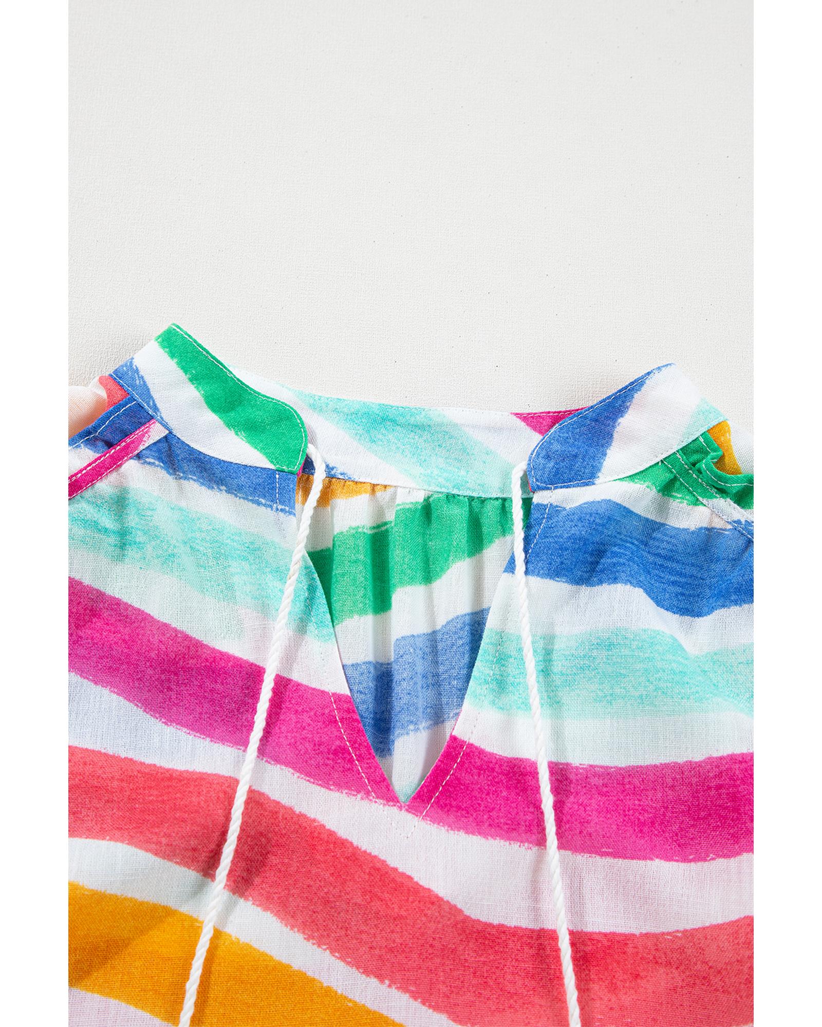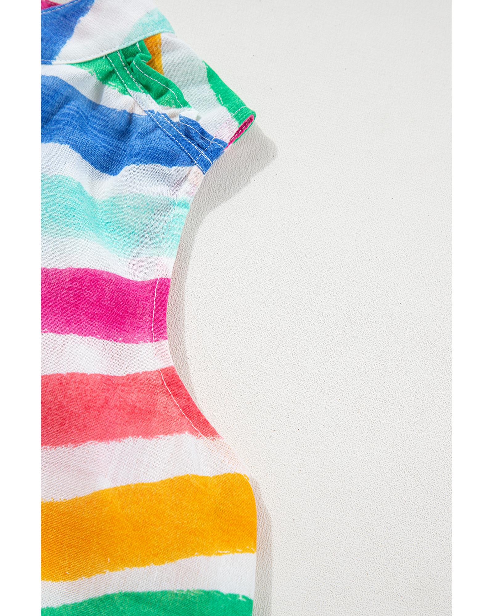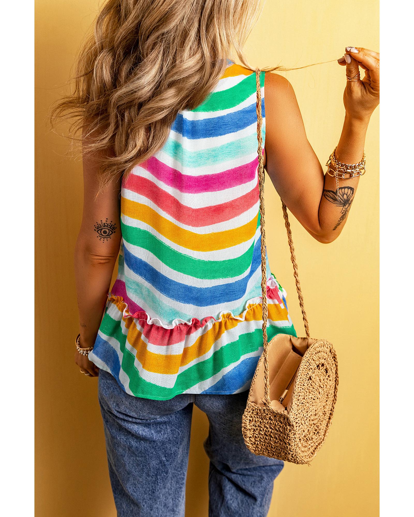 - Rose Red Rainbow Stripes Ruffled Hem Drawstring V Neck Tank Top
