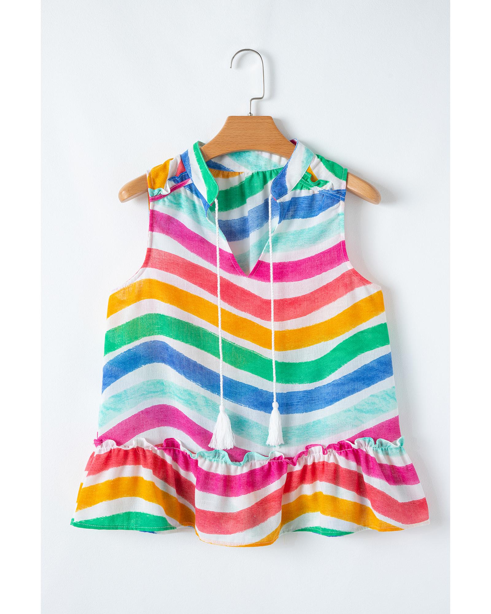 - Rose Red Rainbow Stripes Ruffled Hem Drawstring V Neck Tank Top