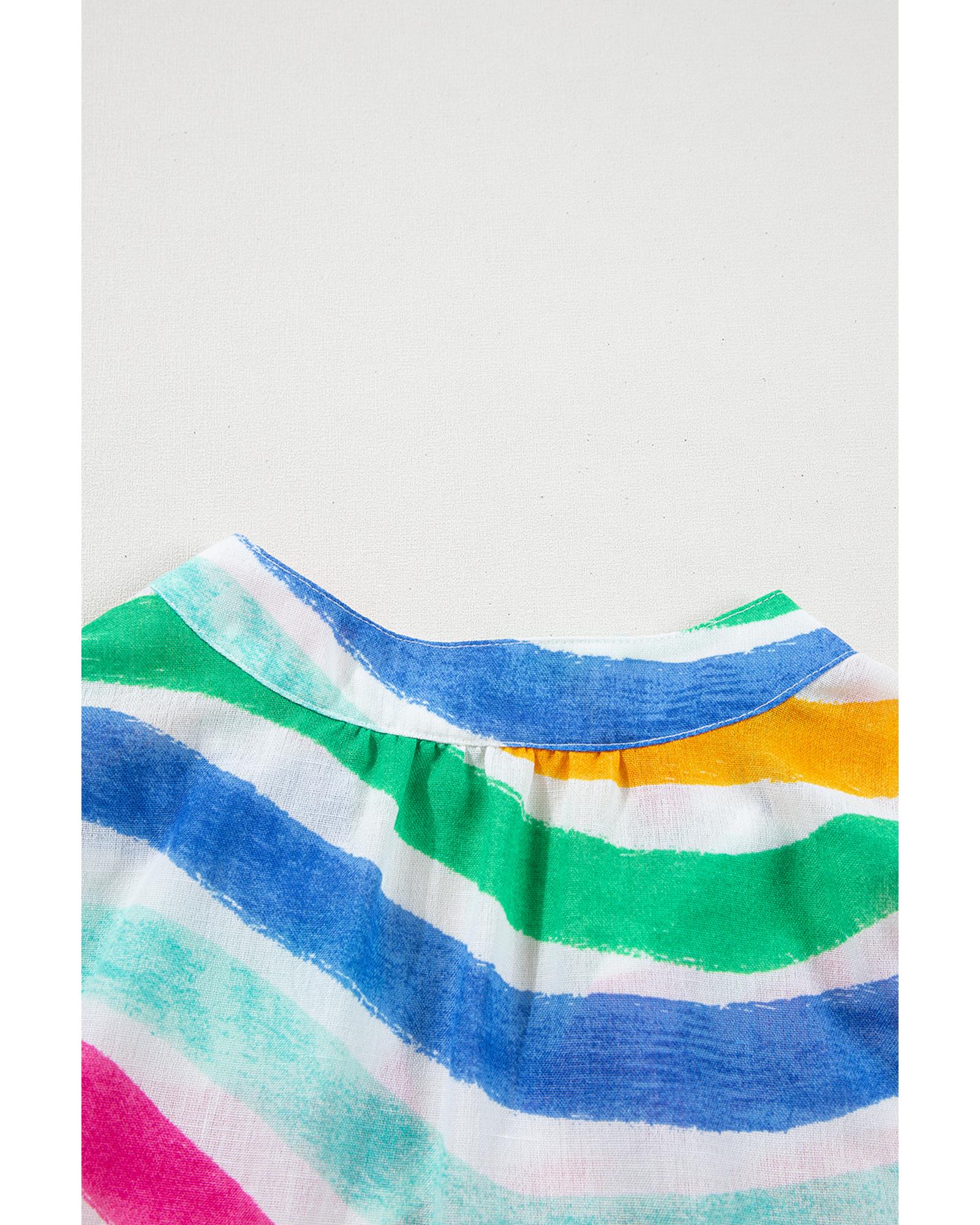 • Rose Red Rainbow Stripes Ruffled Hem Drawstring V Neck Tank Top