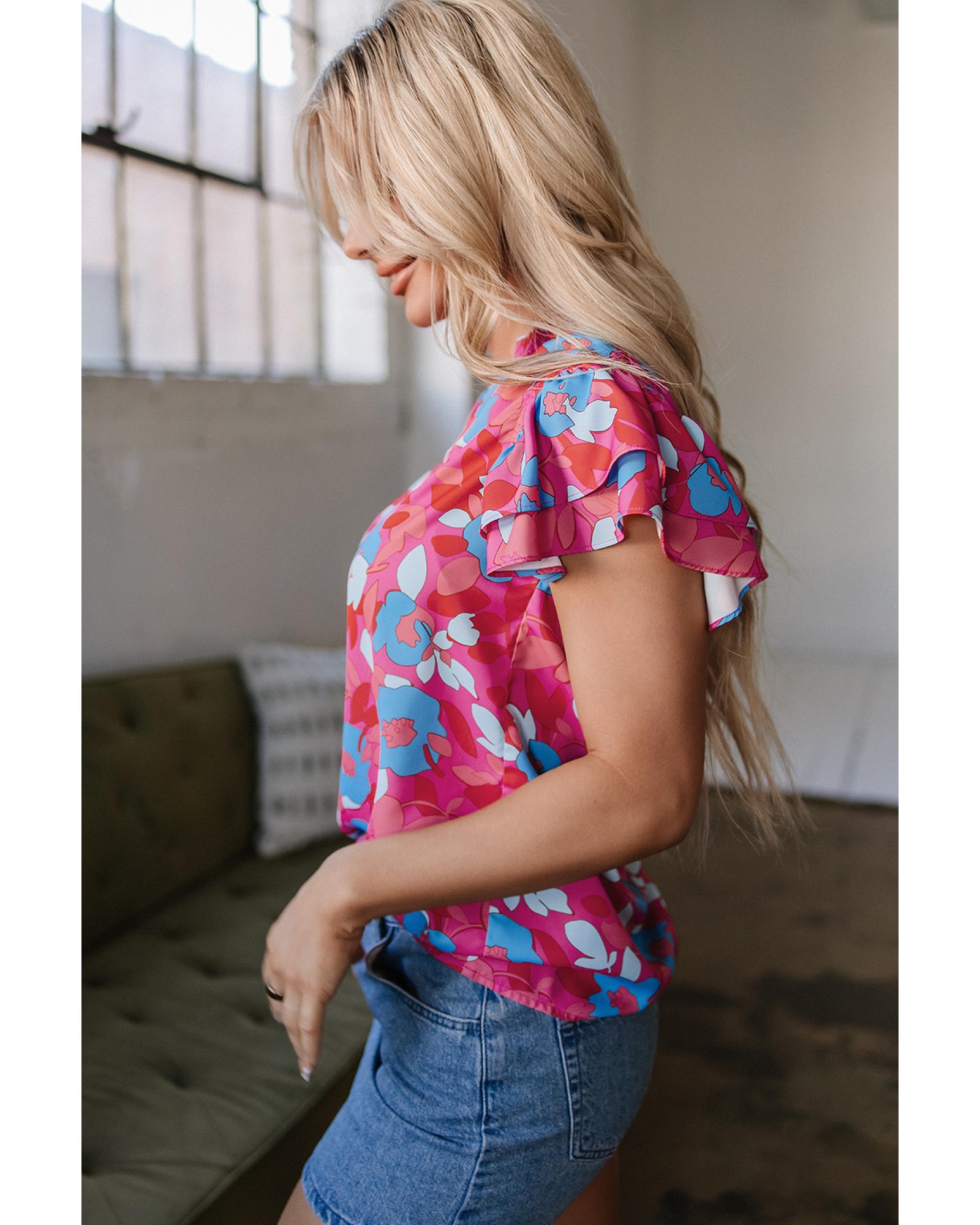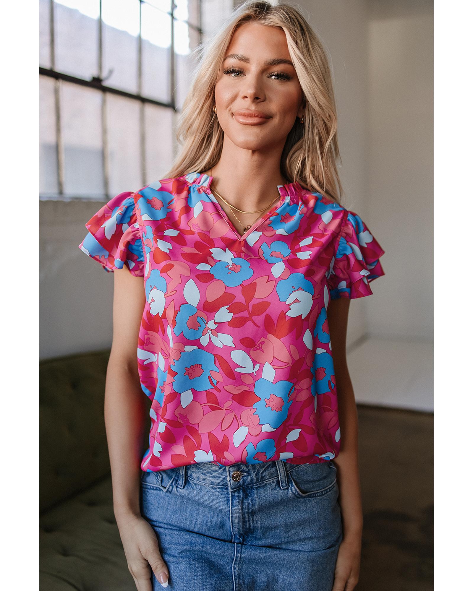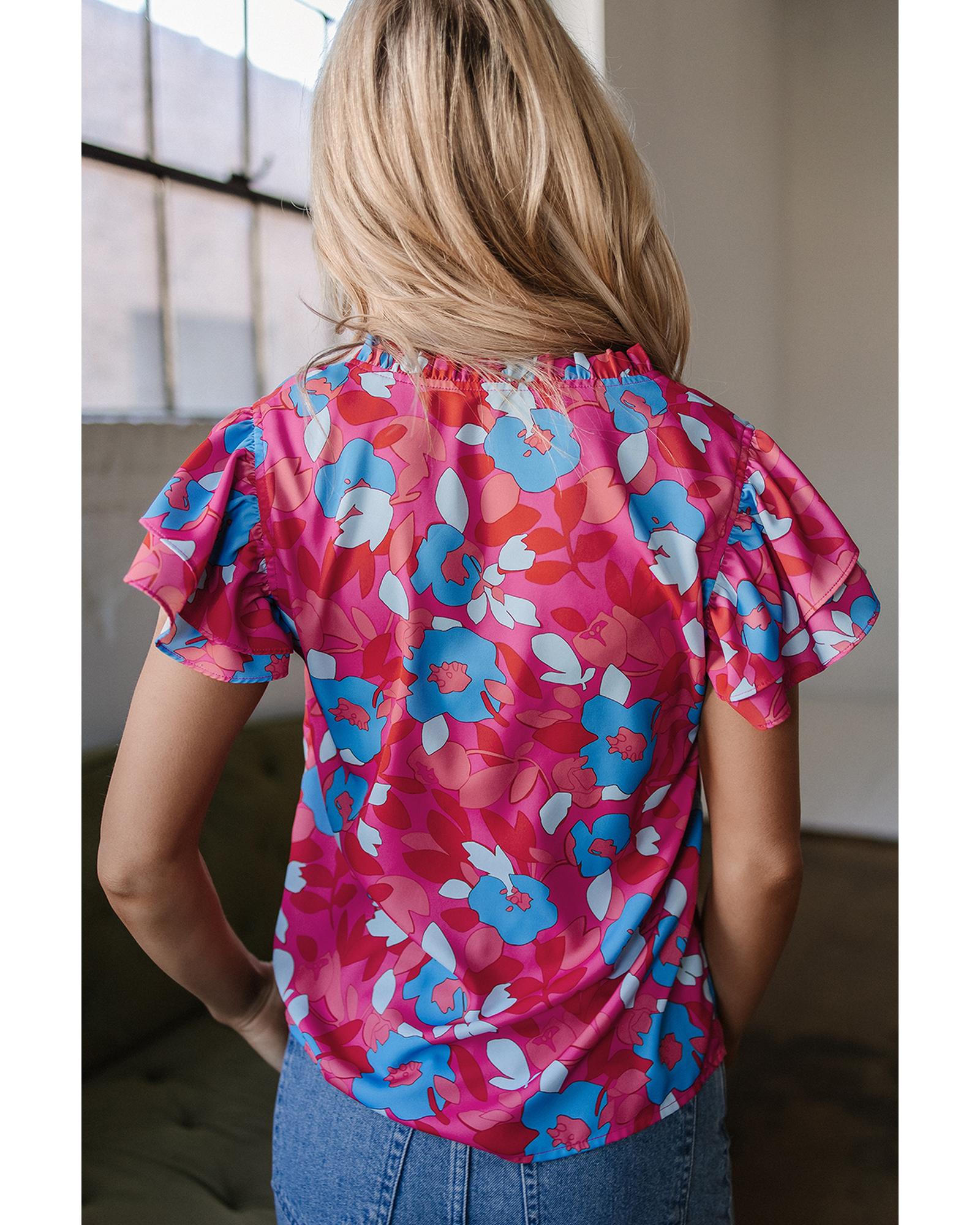 Rose Red Ruffled Sleeve Floral Blouse – M