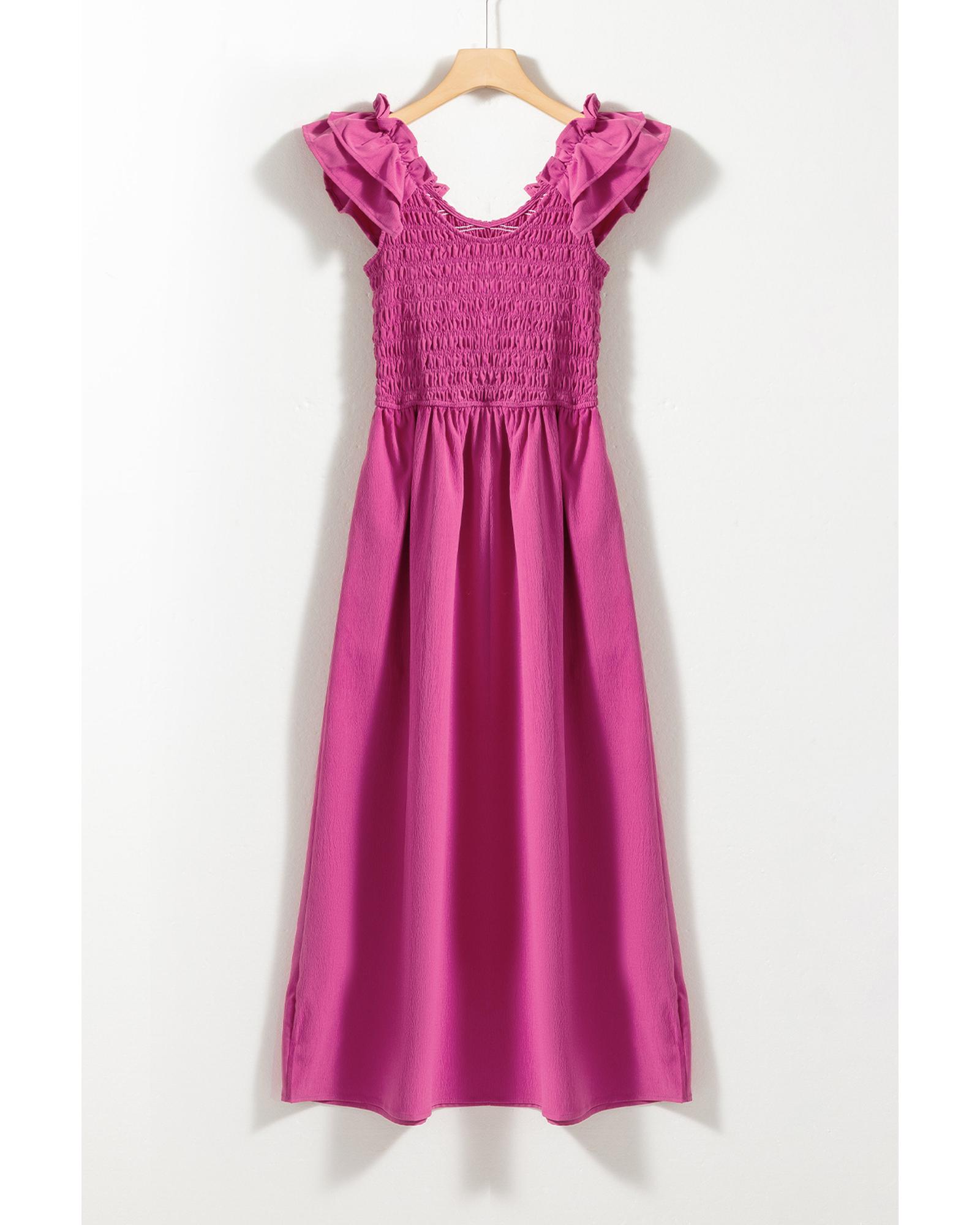 • Rose Red Solid Color Ruffled Straps Smocked Ruched Maxi Dress