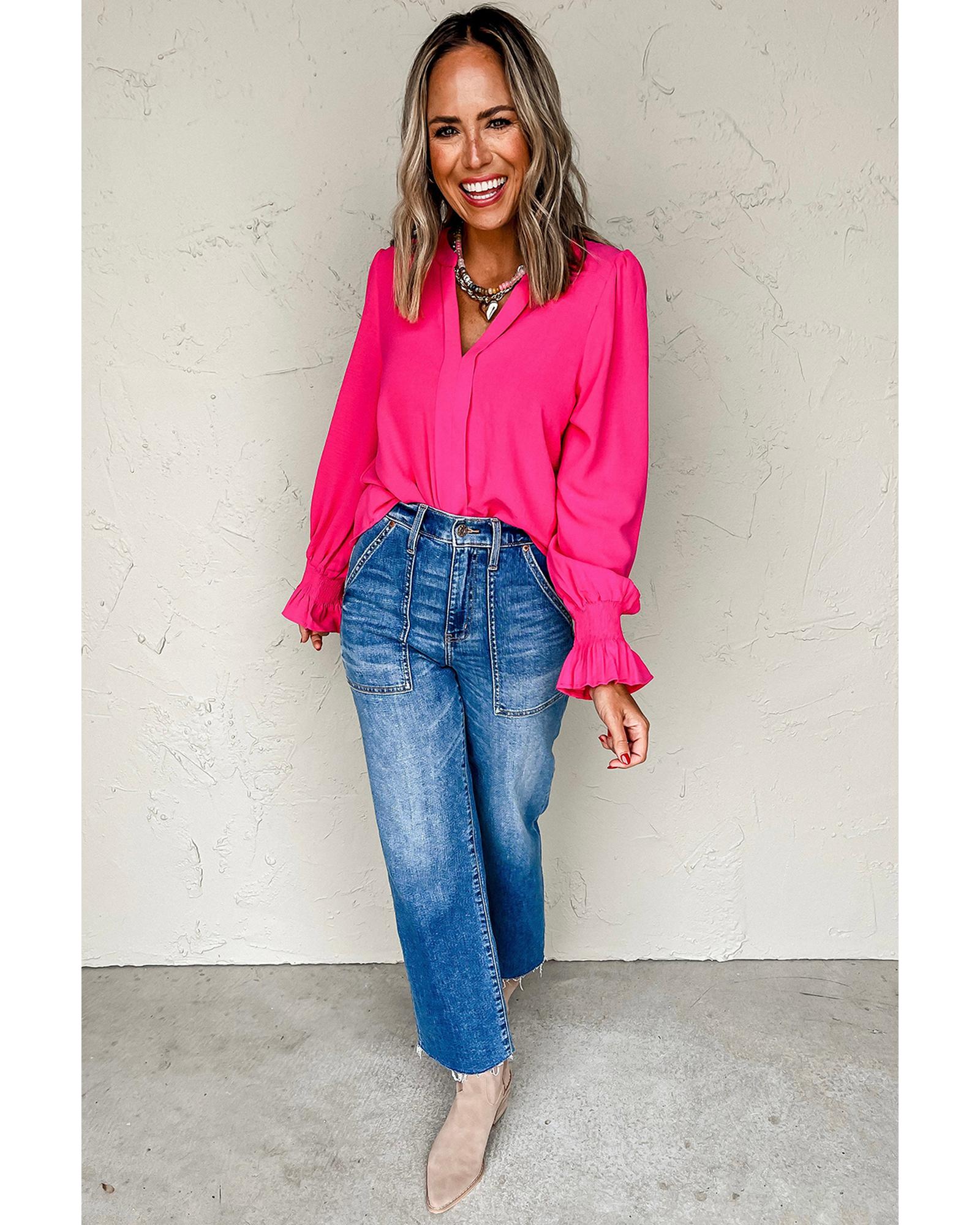 Rose Red Solid Color Shirred Cuff Notch V Neck Blouse – S