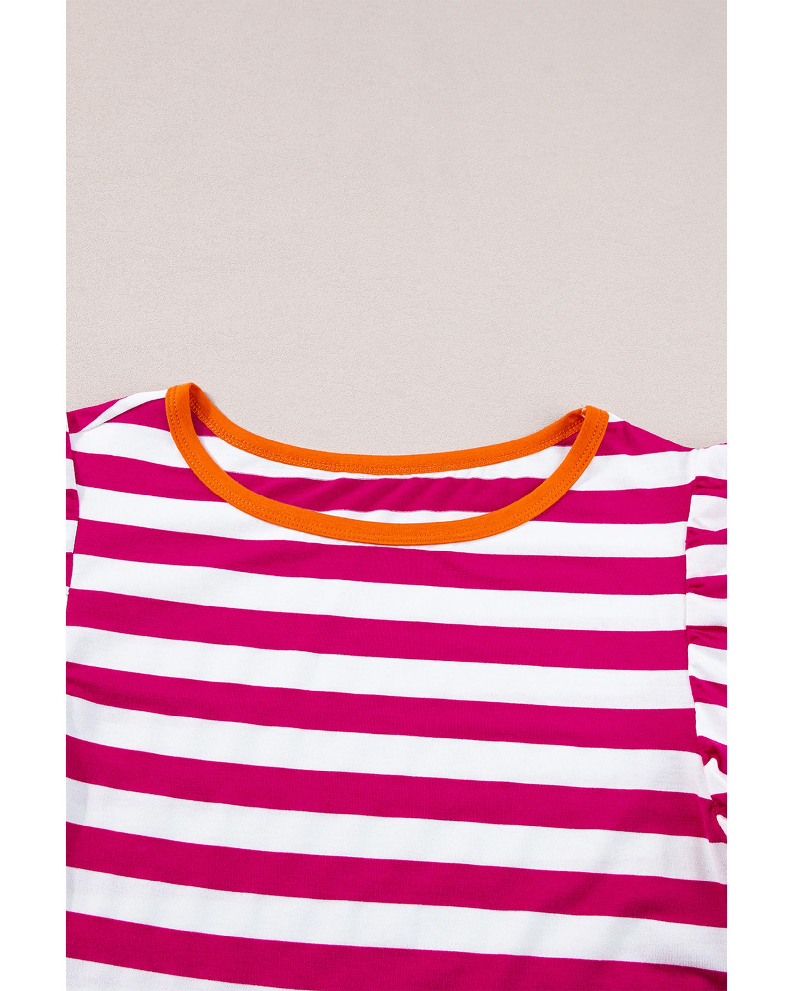 Rose Red Striped Ruffle Sleeve Crew Neck Blouse – M