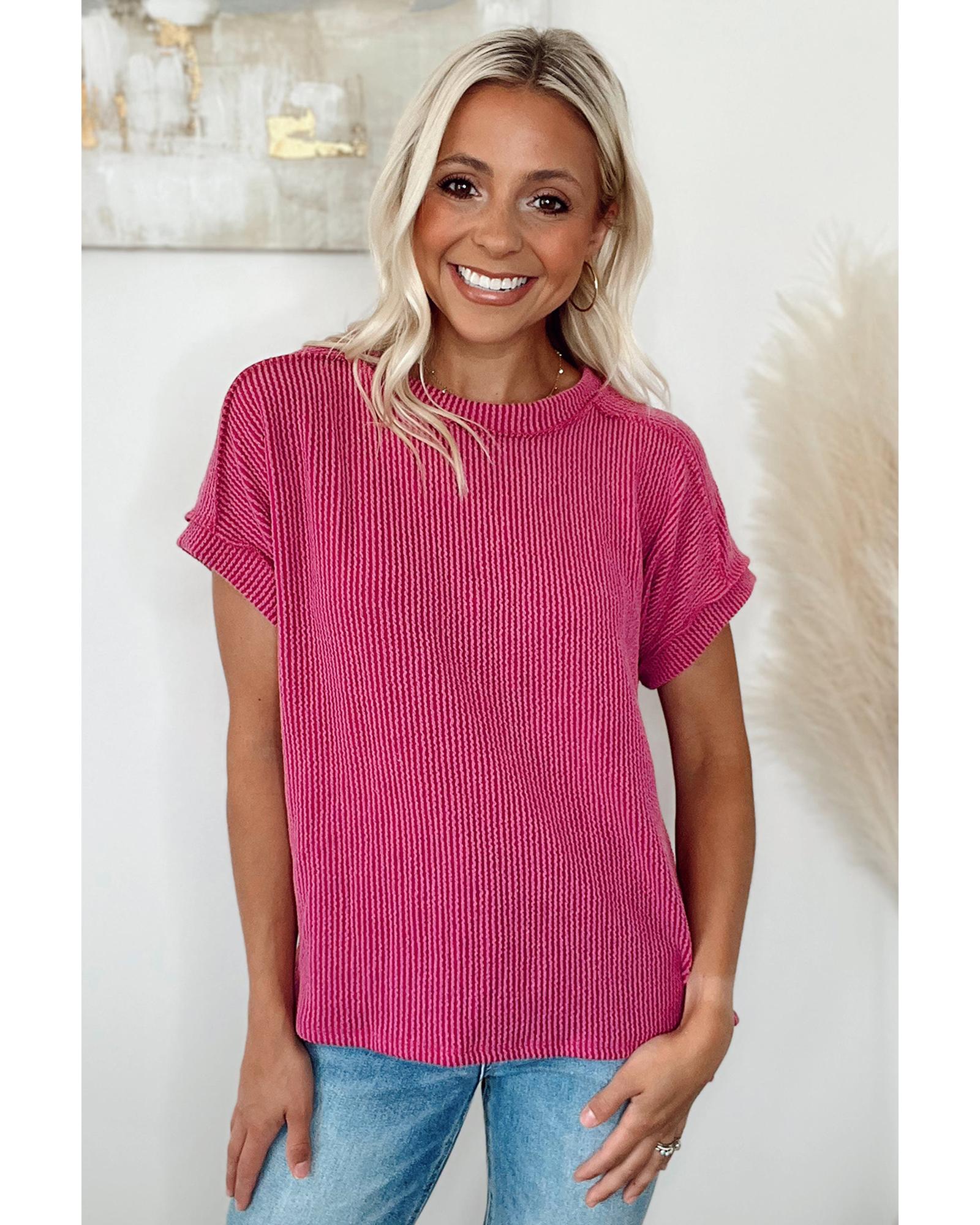 Rose Red Textured Knit Exposed Stitching T-shirt – M