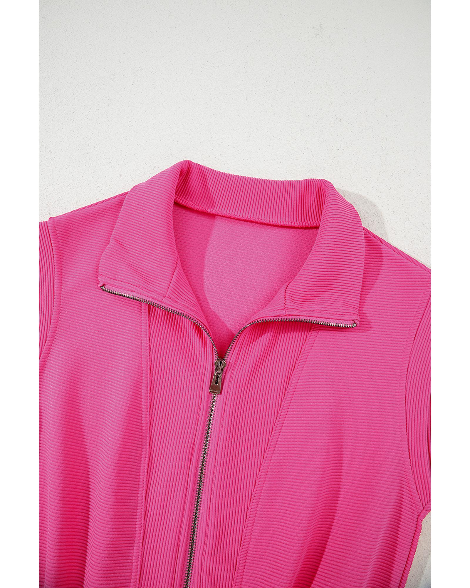 Rose Red Textured Short Sleeve Half Zip Drawstring Waist Romper – XL