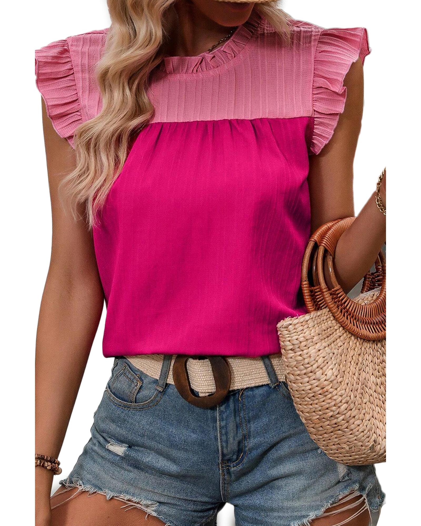 - Rose Red Two Tone Ruffled Flutter Sleeve Blouse