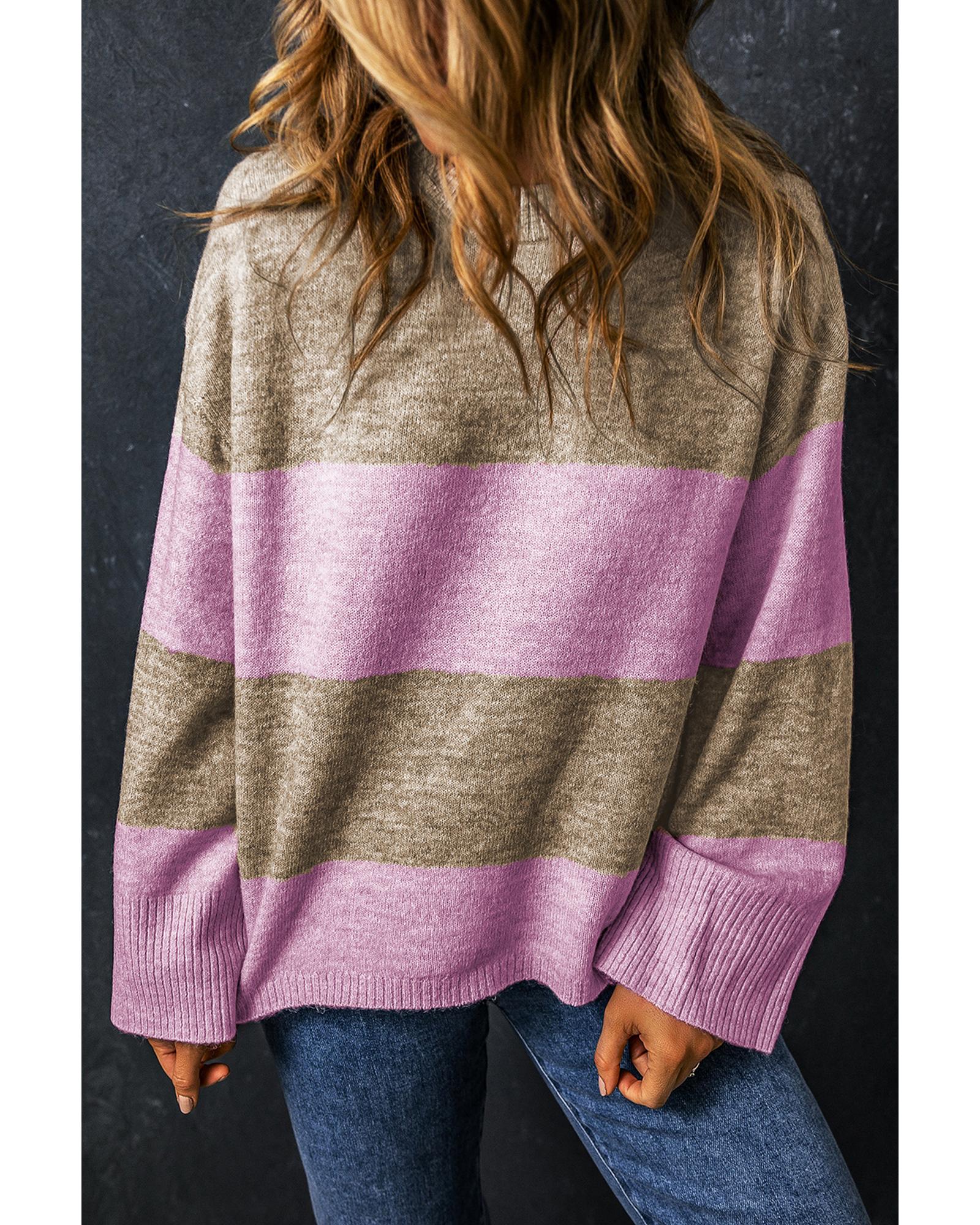 - Luxurious Rose Stripe Crew Neck Wide Sleeve Colorblock Sweater