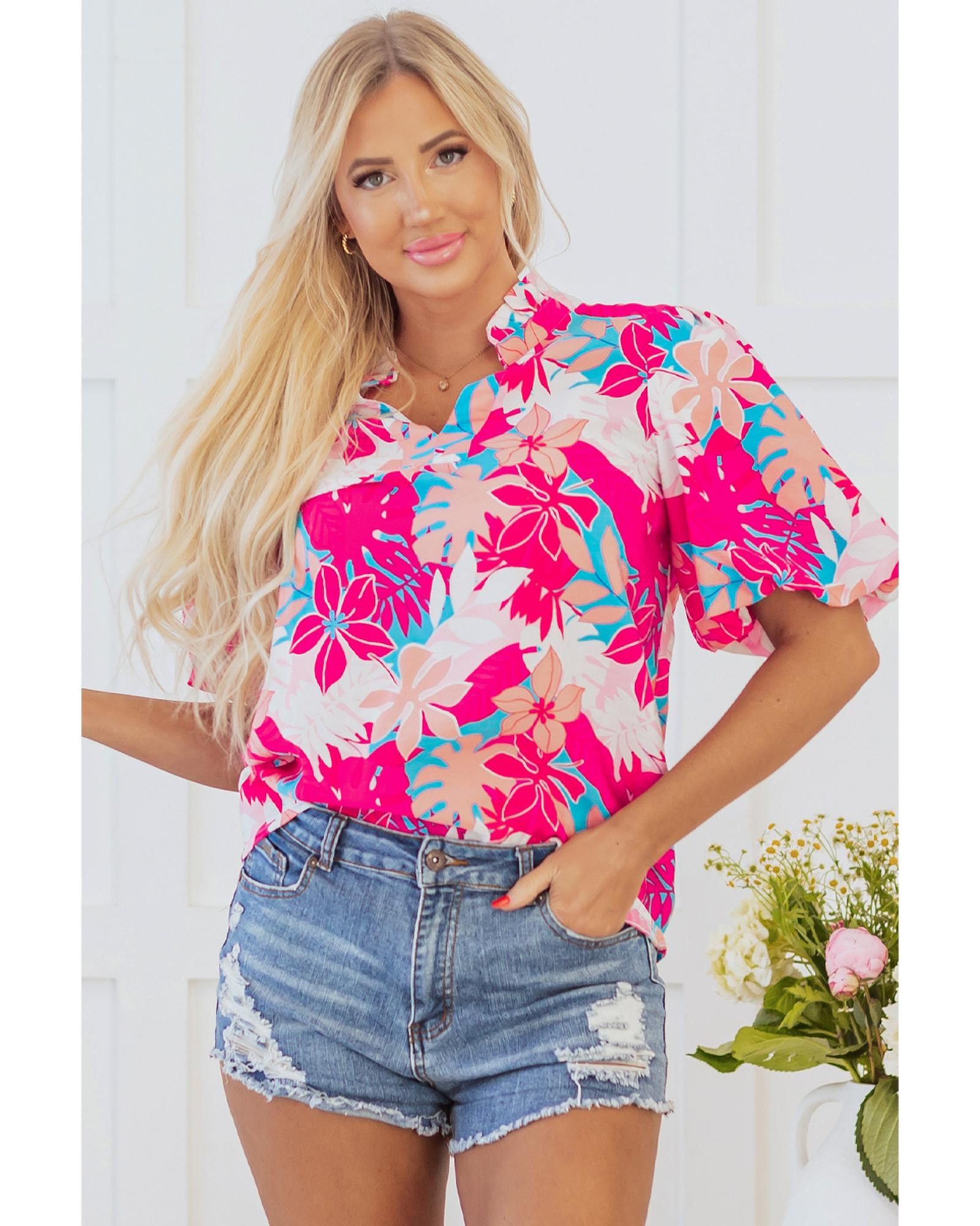 Rose Tropical Plant Printed V Neck Puff Sleeve Blouse – L