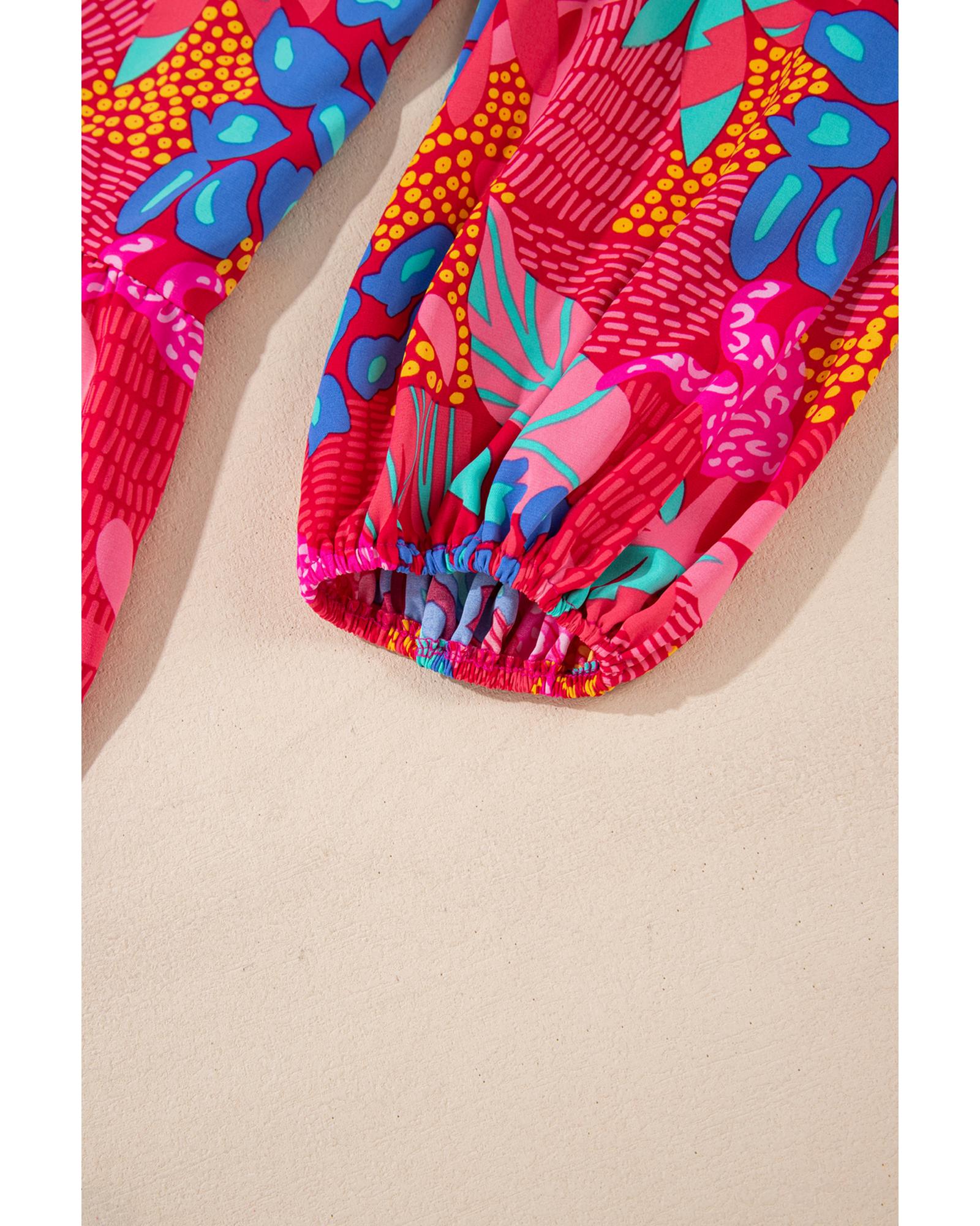 Rose Tropical Printed Lantern Sleeve V Neck Ruffled Plus Size Mini Dress – 4X